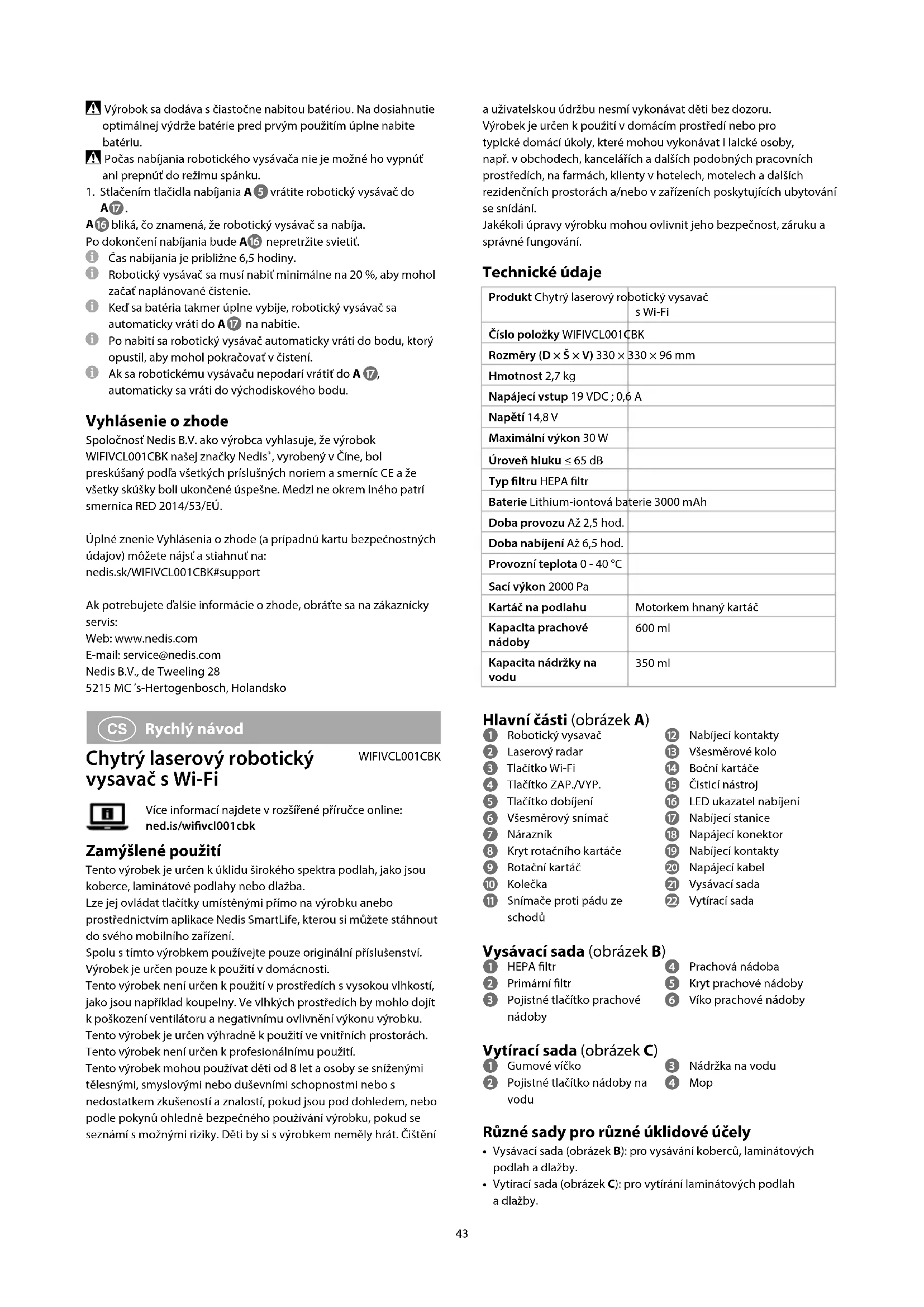 na stabilný a plochý povrch k stene alebo43 a uživatelskou údržbu nesmí vykonávat děti bez dozoru.Výrobek je určen kpoužití vdomácím prostředí nebo pro typické domácí úkoly, které mohou vykonávat i laické osoby, např. vobchodech, kancelářích adalších podobných pracovních prostředích, na farmách, klienty vhotelech, motelech adalších rezidenčních prostorách a/nebo vzařízeních poskytujících ubytování se snídání.Jakékoli úpravy výrobku mohou ovlivnit jeho bezpečnost, záruku a správné fungování. Technické údaje Produkt Chytrý laserový robotický vysavač sWi-FiČíslo položky WIFIVCL001CBKRozměry (D × Š × V) 330 × 330 × 96mmHmotnost 2,7kgNapájecí vstup 19 VDC ; 0,6 ANapětí 14,8 VMaximální výkon 30 WÚroveň hluku ≤ 65 dBTyp ltru HEPA ltrBaterie Lithium-iontová baterie 3000mAhDoba provozu Až 2,5 hod.Doba nabíjení Až 6,5hod.Provozní teplota 0 - 40 °CSací výkon 2000PaKartáč na podlahu Motorkem hnaný kartáčKapacita prachové nádoby600mlKapacita nádržky na vodu 350ml Hlavní části (obrázek A) 1 Robotický vysavač2 Laserový radar3 Tlačítko Wi-Fi4 Tlačítko ZAP./VYP.5 Tlačítko dobíjení6 Všesměrový snímač7 Nárazník8 Kryt rotačního kartáče9 Rotační kartáčq Kolečkaw Snímače proti pádu ze schodůe Nabíjecí kontaktyr Všesměrové kolot Boční kartáčey Čisticí nástroju LED ukazatel nabíjeníi Nabíjecí staniceo Napájecí konektorp Nabíjecí kontaktya Napájecí kabels Vysávací sadad Vytírací sada Vysávací sada (obrázek B) 1 HEPA ltr2 Primární ltr3 Pojistné tlačítko prachové nádoby4 Prachová nádoba5 Kryt prachové nádoby6 Víko prachové nádoby Vytírací sada (obrázek C) 1 Gumové víčko2 Pojistné tlačítko nádoby na vodu 3 Nádržka na vodu4 Mop Různé sady pro různé úklidové účely