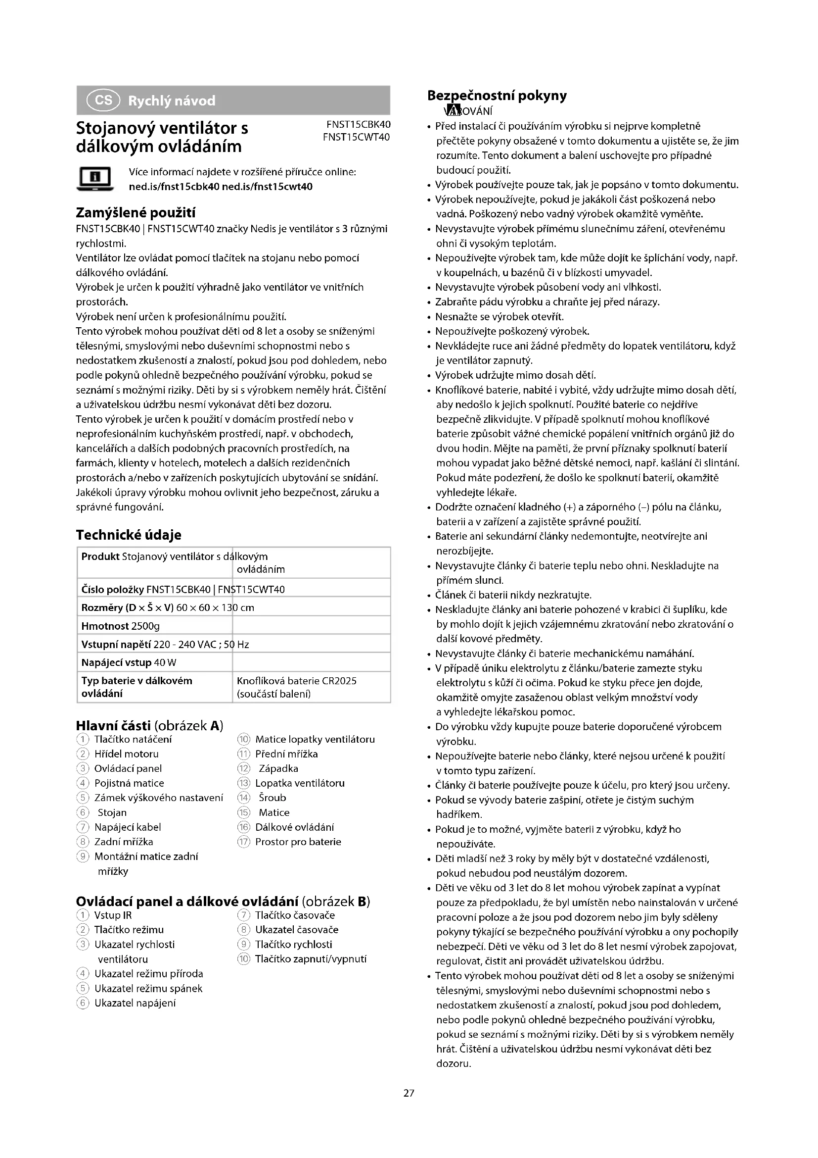 Rychlý návod Stojanový ventilátor s dálkovým ovládáním FNST15CBK40 FNST15CWT40Více informací najdete v rozšířené příručce online: ned.is/fnst15cbk40 ned.is/fnst15cwt40 Zamýšlené použití FNST15CBK40 | FNST15CWT40 značky Nedis je ventilátor s 3 různými rychlostmi.Ventilátor lze ovládat pomocí tlačítek na stojanu nebo pomocí dálkového ovládání.Výrobek je určen k použití výhradně jako ventilátor ve vnitřních prostorách.Výrobek není určen k profesionálnímu použití.Tento výrobek mohou používat děti od 8 let a osoby se sníženými tělesnými, smyslovými nebo duševními schopnostmi nebo s nedostatkem zkušeností a znalostí, pokud jsou pod dohledem, nebo podle pokynů ohledně bezpečného používání výrobku, pokud se seznámí s možnými riziky. Děti by si s výrobkem neměly hrát. Čištění a uživatelskou údržbu nesmí vykonávat děti bez dozoru.Tento výrobek je určen kpoužití vdomácím prostředí nebo v neprofesionálním kuchyňském prostředí, např. v obchodech, kancelářích a dalších podobných pracovních prostředích, na farmách, klienty v hotelech, motelech a dalších rezidenčních prostorách a/nebo v zařízeních poskytujících ubytování se snídání.Jakékoli úpravy výrobku mohou ovlivnit jeho bezpečnost, záruku a správné fungování. Technické údaje Produkt Stojanový ventilátor s dálkovým ovládánímČíslo položky FNST15CBK40 | FNST15CWT40Rozměry (D × Š × V) 60 × 60 × 130 cmHmotnost 2500gVstupní napětí 220 - 240 VAC ; 50 HzNapájecí vstup 40 WTyp baterie v dálkovém ovládáníKnoíková baterie CR2025 (součástí balení) Hlavní části (obrázek A) 1 Tlačítko natáčení 2 Hřídel motoru 3 Ovládací panel 4 Pojistná matice 5 Zámek výškového nastavení 6 Stojan 7 Napájecí kabel 8 Zadní mřížka 9 Montážní matice zadní mřížky q Matice lopatky ventilátoru w Přední mřížka e Západka r Lopatka ventilátoru t Šroub y Matice u Dálkové ovládání i Prostor pro baterie Ovládací panel a dálkové ovládání (obrázek B) 1 Vstup IR 2 Tlačítko režimu 3 Ukazatel rychlosti ventilátoru 4 Ukazatel režimu příroda 5 Ukazatel režimu spánek 6 Ukazatel napájení 7 Tlačítko časovače 8 Ukazatel časovače 9 Tlačítko rychlosti q Tlačítko zapnutí/vypnutí28