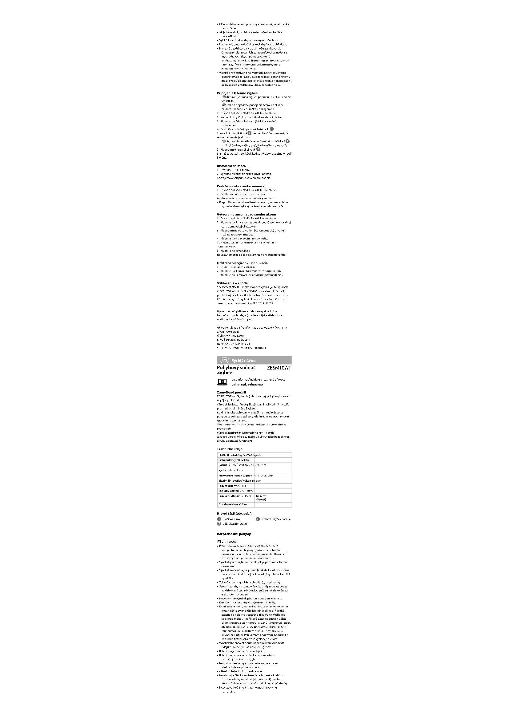 Rychlý návod Pohybový snímač Zigbee ZBSM10WT Více informací najdete v rozšířené příručce online: ned.is/zbsm10wtZamýšlené použitíZBSM10WT značky Nedis je bezdrátový pohybový snímač napájený zbaterie.Výrobek lze bezdrátově připojit kaplikaci Nedis SmartLife prostřednictvím brány Zigbee.Když je výrobek připojený, aktuální aminulé detekce pohybu se zobrazí vaplikaci, kde lze také naprogramovat spouštění automatizací.Tento výrobek je určen výhradně k použití ve vnitřních prostorách.Výrobek není určen k profesionálnímu použití.Jakékoli úpravy výrobku mohou ovlivnit jeho bezpečnost, záruku a správné fungování.Technické údajeProdukt Pohybový snímač ZigbeeČíslo položky ZBSM10WTRozměry (D × Š × V) 46 × 46 × 30mmVýdrž baterie 1rokFrekvenční rozsah Zigbee 2405 - 2480 GHzMaximální vysílací výkon 10 dBmPříjem antény 2,8 dBiTeplotní rozsah 0 °C - 40 °CProvozní vlhkost < 100 % RH (relativní vlhkost)Dosah detekce až 7 mHlavní části (obrázek A) Tlačítko funkcí LED ukazatel stavu Izolační jazýček baterieBezpečnostní pokyny VAROVÁNÍ• Před instalací či používáním výrobku si nejprve kompletně přečtěte pokyny obsažené v tomto dokumentu a ujistěte se, že jim rozumíte. Dokument uschovejte pro případné budoucí použití.• Výrobek používejte pouze tak, jak je popsáno v tomto dokumentu.• Výrobek nepoužívejte, pokud je jakákoli část poškozená nebo vadná. Poškozený nebo vadný výrobek okamžitě vyměňte.• Zabraňte pádu výrobku a chraňte jej před nárazy.• Servisní zásahy na tomto výrobku smí provádět pouze kvalikovaný technik údržby, sníží se tak riziko úrazu elektrickým proudem.• Nevystavujte výrobek působení vody ani vlhkosti.• Dohlížejte na děti, aby si s výrobkem nehrály.• Knoíkové baterie, nabité i vybité, vždy udržujte mimo dosah dětí, aby nedošlo k jejich spolknutí. Použité baterie co nejdříve bezpečně zlikvidujte. V případě spolknutí mohou knoíkové baterie způsobit vážné chemické popálení vnitřních orgánů již do dvou hodin. Mějte na paměti, že první příznaky spolknutí baterií mohou vypadat jako běžné dětské nemoci, např. kašlání či slintání. Pokud máte podezření, že došlo ke spolknutí baterií, okamžitě vyhledejte lékaře.• Výrobek lze napájet pouze napětím, které odpovídá údajům uvedeným na označení výrobku.• Baterie na jedno použití nenabíjejte.• Baterie ani sekundární články nedemontujte, neotvírejte ani nerozbíjejte.• Nevystavujte články či baterie teplu nebo ohni. Neskladujte na přímém slunci.• Článek či baterii nikdy nezkratujte.• Neskladujte články ani baterie pohozené v krabici či šuplíku, kde by mohlo dojít k jejich vzájemnému zkratování nebo zkratování o další kovové předměty.• Nevystavujte články či baterie mechanickému namáhání.• V případě úniku elektrolytu z článku/baterie zamezte styku elektrolytu s kůží či očima. Pokud ke styku přece jen dojde, okamžitě omyjte zasaženou oblast velkým množství vody a vyhledejte lékařskou pomoc.• Dodržte označení kladného (+) a záporného (–) pólu na článku, baterii a v zařízení a zajistěte správné použití.• Nepoužívejte baterie nebo články, které nejsou určené k použití v tomto typu zařízení.• Pokud dojde ke spolknutí článku nebo baterie, okamžitě vyhledejte lékařskou pomoc.• Do výrobku vždy kupujte pouze baterie doporučené výrobcem výrobku.• Udržujte články a baterie v suchu a čistotě.• Pokud se vývody baterie zašpiní, otřete je čistým suchým hadříkem.• Články či baterie používejte pouze k účelu, pro který jsou určeny.• Pokud je to možné, vyjměte baterii z výrobku, když ho nepoužíváte.• Vybitou baterii ekologicky zlikvidujte.• Děti smějí baterii používat pouze pod dohledem.• Některé bezdrátové výrobky mohou způsobovat rušení implantabilních zdravotnických zařízení a dalšího zdravotnického vybavení, jako jsou například kardiostimulátory, kochleární implantáty a naslouchátka. Více informací získáte od výrobce svého zdravotnického zařízení.• Nepoužívejte výrobek v místech, kde je použití bezdrátových zařízení zakázáno kvůli potenciálnímu rušení ostatních elektronických zařízení, což by mohlo vést ke vzniku bezpečnostního rizika.Připojení k bráně Zigbee Ujistěte se, že je kaplikaci Nedis SmartLife připojena brána Zigbee. Více informací opřipojení brány kaplikaci najdete vpříručce kbráně.1. Otevřete ve svém telefonu aplikace Nedis SmartLife.2. Výběrem brány Zigbee přejděte do rozhraní brány.3. Klepněte na Add subdevice (Přidat dílčí zařízení).4. Odstraňte izolační jazýček baterie A