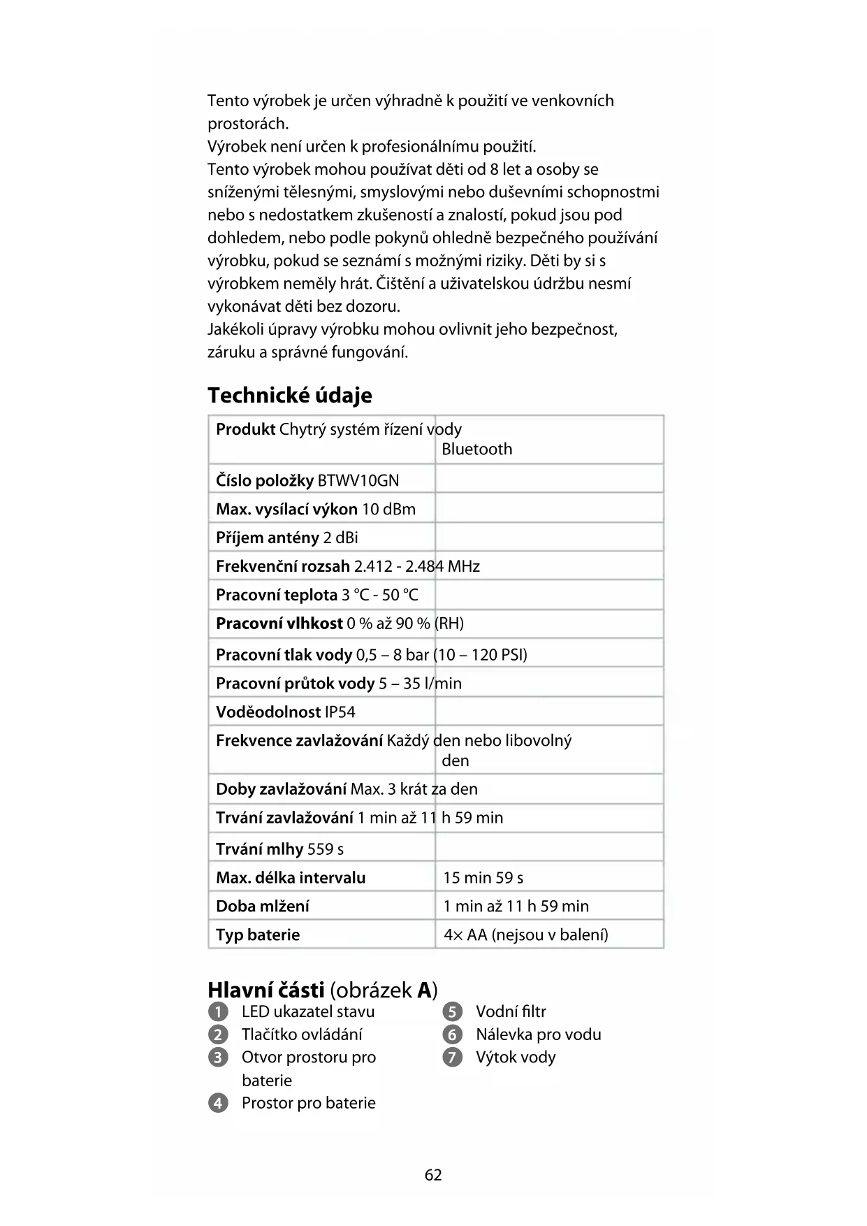 Rychlý návod Chytrý systém řízení vody Bluetooth BTWV10GNVíce informací najdete v rozšířené příručce online: ned.is/btwv10gn Zamýšlené použití BTWV10GN značky Nedis je chytrý systém řízení vody prostřednictvím Bluetooth, který umožňuje plánování zavlažování.Výrobek lze ovládat prostřednictvím aplikace Nedis SmartLife.62 Tento výrobek je určen výhradně kpoužití ve venkovních prostorách. Výrobek není určen k profesionálnímu použití. Tento výrobek mohou používat děti od 8 let a osoby se sníženými tělesnými, smyslovými nebo duševními schopnostmi nebo s nedostatkem zkušeností a znalostí, pokud jsou pod dohledem, nebo podle pokynů ohledně bezpečného používání výrobku, pokud se seznámí s možnými riziky. Děti by si s výrobkem neměly hrát. Čištění a uživatelskou údržbu nesmí vykonávat děti bez dozoru. Jakékoli úpravy výrobku mohou ovlivnit jeho bezpečnost, záruku a správné fungování. Technické údaje Produkt Chytrý systém řízení vody Bluetooth Číslo položky BTWV10GN Max. vysílací výkon 10 dBm Příjem antény 2 dBi Frekvenční rozsah 2.412 - 2.484 MHz Pracovní teplota 3 °C - 50 °C Pracovní vlhkost 0% až 90% (RH) Pracovní tlak vody 0,5 – 8bar (10 – 120PSI) Pracovní průtok vody 5 – 35l/min Voděodolnost IP54 Frekvence zavlažování Každý den nebo libovolný den Doby zavlažování Max. 3 krát za den Trvání zavlažování 1min až 11h 59min Trvání mlhy 559s Max. délka intervalu 15min 59s Doba mlžení 1min až 11h 59min Typ baterie 4× AA (nejsou v balení) Hlavní části (obrázek A) 1 LED ukazatel stavu 2 Tlačítko ovládání 3 Otvor prostoru pro baterie 4 Prostor pro baterie 5 Vodní ltr 6 Nálevka pro vodu 7 Výtok vody63 Přehled aplikace (obrázek B) 1 Naposledy použitá voda 2 Stav baterie / Právě aktivní režim / Zbývající čas do dalšího zavlažování 3 Manuální režim 4 Parametr 5 Přepíná mezi stupni Celsia a Fahrenheita. 6 Upravit rozvrh zavlažování 7 Čidlo 8 Podrobnosti apokyny Bezpečnostní pokyny