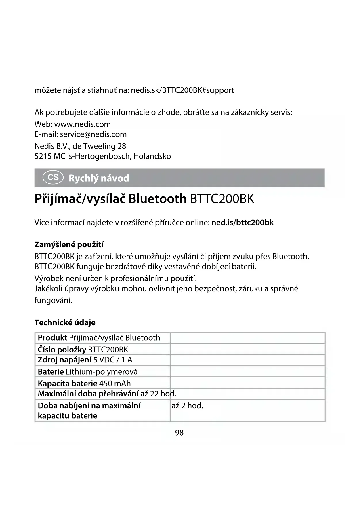 Rychlý návod Přijímač/vysílač Bluetooth BTTC200BK Více informací najdete v rozšířené příručce online: ned.is/bttc200bk Zamýšlené použití BTTC200BK je zařízení, které umožňuje vysílání či příjem zvuku přes Bluetooth. BTTC200BK funguje bezdrátově díky vestavěné dobíjecí baterii. Výrobek není určen k profesionálnímu použití. Jakékoli úpravy výrobku mohou ovlivnit jeho bezpečnost, záruku a správné fungování. Technické údaje Produkt Přijímač/vysílač Bluetooth Číslo položky BTTC200BK Zdroj napájení 5 VDC / 1 A Baterie Lithium-polymerová Kapacita baterie 450 mAh Maximální doba přehrávání až 22 hod. Doba nabíjení na maximální kapacitu baterie až 2 hod.99 Pohotovostní doba až 48 hod. Verze Bluetooth® 5.0 Maximální přenosový příkon 1,31 dBm Frekvenční rozsah Bluetooth 2402–2480 MHz Dosah signálu Bluetooth až 10 metrů Proly Bluetooth A2DP Podporované kodeky SBC / aptX