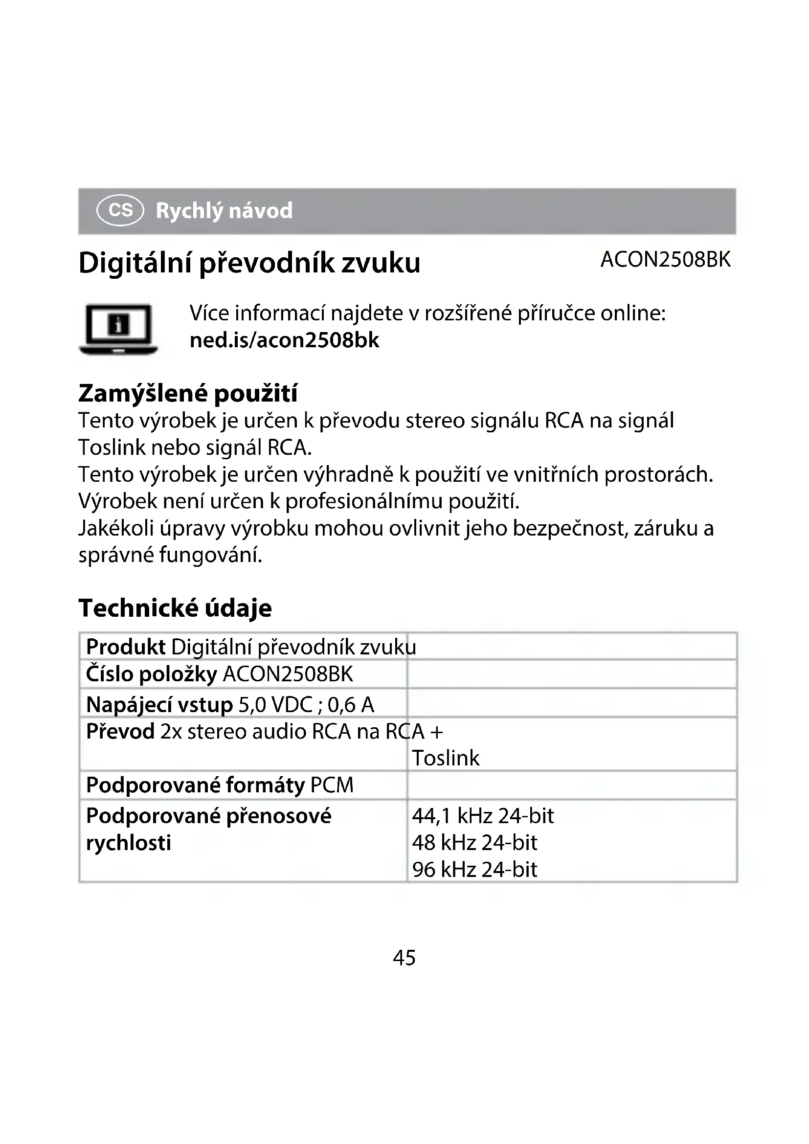 Rychlý návod Digitální převodník zvuku ACON2508BK Více informací najdete v rozšířené příručce online: ned.is/acon2508bk Zamýšlené použití Tento výrobek je určen kpřevodu stereo signálu RCA na signál Toslink nebo signál RCA. Tento výrobek je určen výhradně k použití ve vnitřních prostorách. Výrobek není určen k profesionálnímu použití. Jakékoli úpravy výrobku mohou ovlivnit jeho bezpečnost, záruku a správné fungování. Technické údaje Produkt Digitální převodník zvuku Číslo položky ACON2508BK Napájecí vstup 5,0 VDC ; 0,6 A Převod 2x stereo audio RCA na RCA + Toslink Podporované formáty PCM Podporované přenosové rychlosti 44,1 kHz 24-bit 48 kHz 24-bit 96 kHz 24-bit46 Hlavní části (obrázek A)
