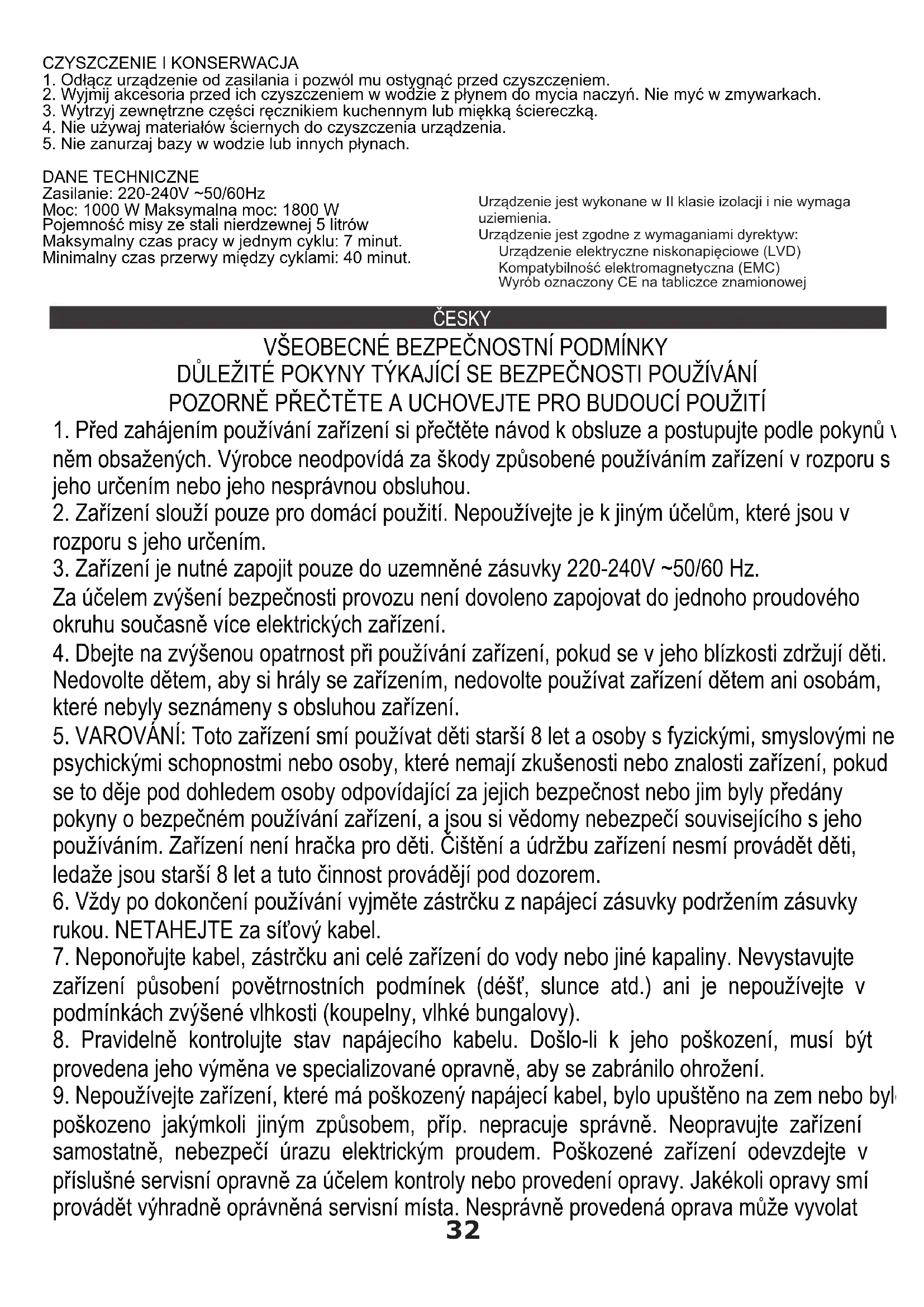 psychickými schopnostmi nebo osoby, které nemají zkušenosti nebo znalosti zařízení, pokud se to děje pod dohledem osoby odpovídající za jejich bezpečnost nebo jim byly předány pokyny o bezpečném používání zařízení, a jsou si vědomy nebezpečí souvisejícího s jeho používáním. Zařízení není hračka pro děti. Čištění a údržbu zařízení nesmí provádět děti, ledaže jsou starší 8 let a tuto činnost provádějí pod dozorem. Za účelem zvýšení bezpečnosti provozu není dovoleno zapojovat do jednoho proudového okruhu současně více elektrických zařízení.