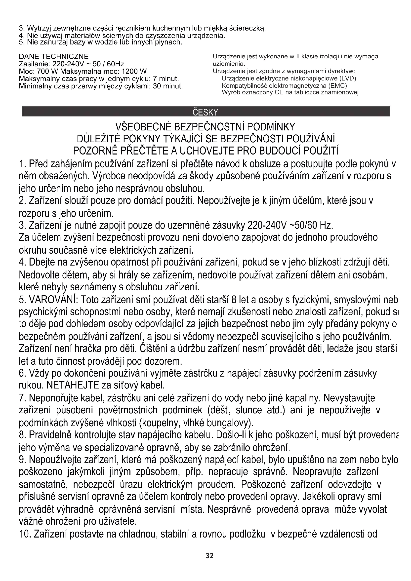 zařízení působení povětrnostních podmínek (déšť, slunce atd.) ani je nepoužívejte v podmínkách zvýšené vlhkosti (koupelny, vlhké bungalovy). DŮLEŽITÉ POKYNY TÝKAJÍCÍ SE BEZPEČNOSTI POUŽÍVÁNÍ Za účelem zvýšení bezpečnosti provozu není dovoleno zapojovat do jednoho proudového okruhu současně více elektrických zařízení. POZORNĚ PŘEČTĚTE A UCHOVEJTE PRO BUDOUCÍ POUŽITÍ