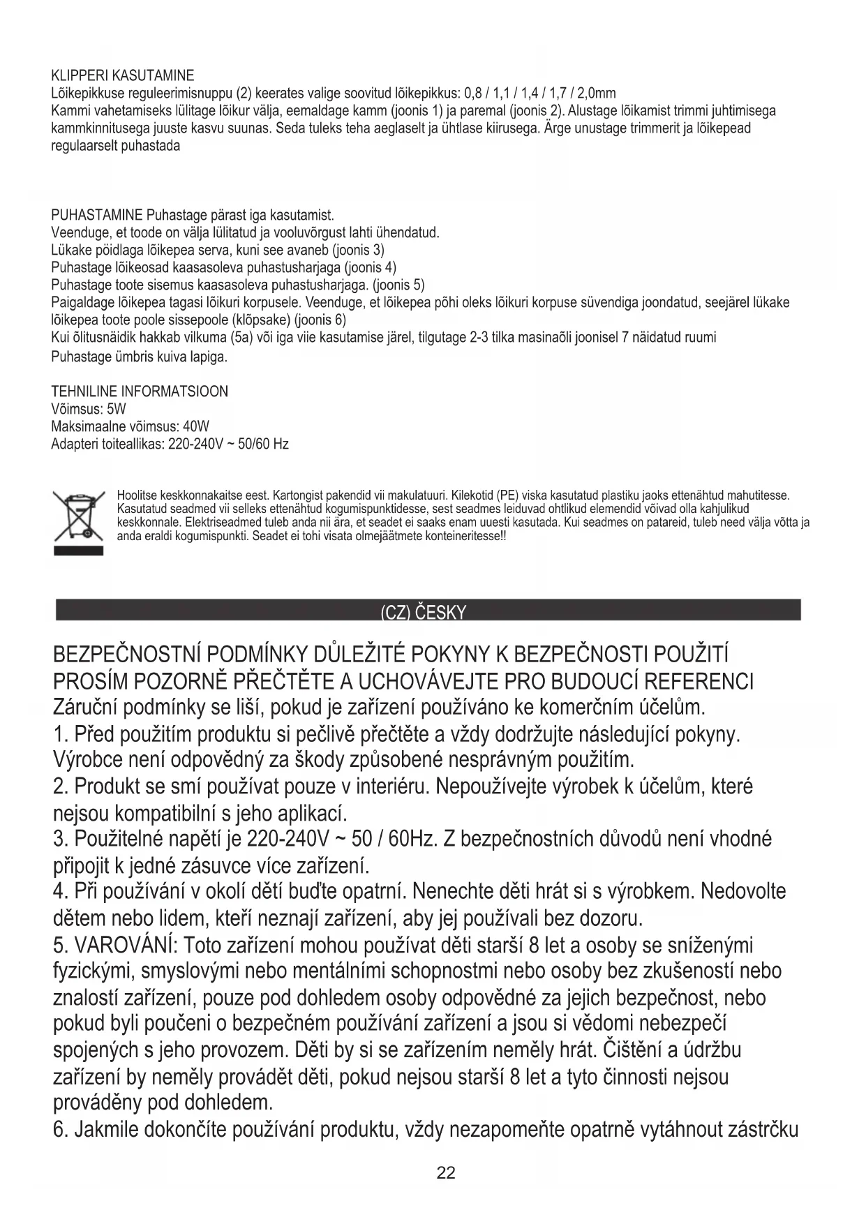 poškození baterie.24 Palcem zatlačte na okraj žací hlavy, dokud se neotevře (obr.3) Vyčistěte řezné části pomocí dodaného čisticího kartáče (obr.4) ČIŠTĚNÍ Po každém použití vyčistěte. Chcete-li hřeben změnit, vypněte strojek, odepněte hřeben (obr. 1) a sponu na pravém (obr. 2). Začněte stříhat spuštěním zastřihovače s hřebenovým nástavcem proti směru růstu vlasů. To by mělo být prováděno pomalu a stálou rychlostí. Nezapomeňte pravidelně čistit zastřihovač a stříhací hlavu od všech vlasů Ujistěte se, že je produkt vypnutý a odpojený od elektrické sítě. Maximální výkon: 40 W. Vraťte řezací hlavu zpět na tělo strojku. Ujistěte se, že je spodní část řezací hlavy zarovnaná s vybráním těla strojku, a poté zatlačte řezací hlavu dovnitř k produktu (cvaknutí) (obr.6) Vyčistěte vnitřek produktu dodaným čisticím kartáčem. (obr.5) Očistěte kryt suchým hadříkem. Když indikátor mazání začne blikat (5a) nebo každých pět použití, nakapejte 2-3 kapky strojního oleje do prostoru zobrazeného na obr.7 TECHNICKÉ INFORMACE Jmenovitý výkon: 5W Adaptér Napájení: 220-240V ~ 50/60 Hz