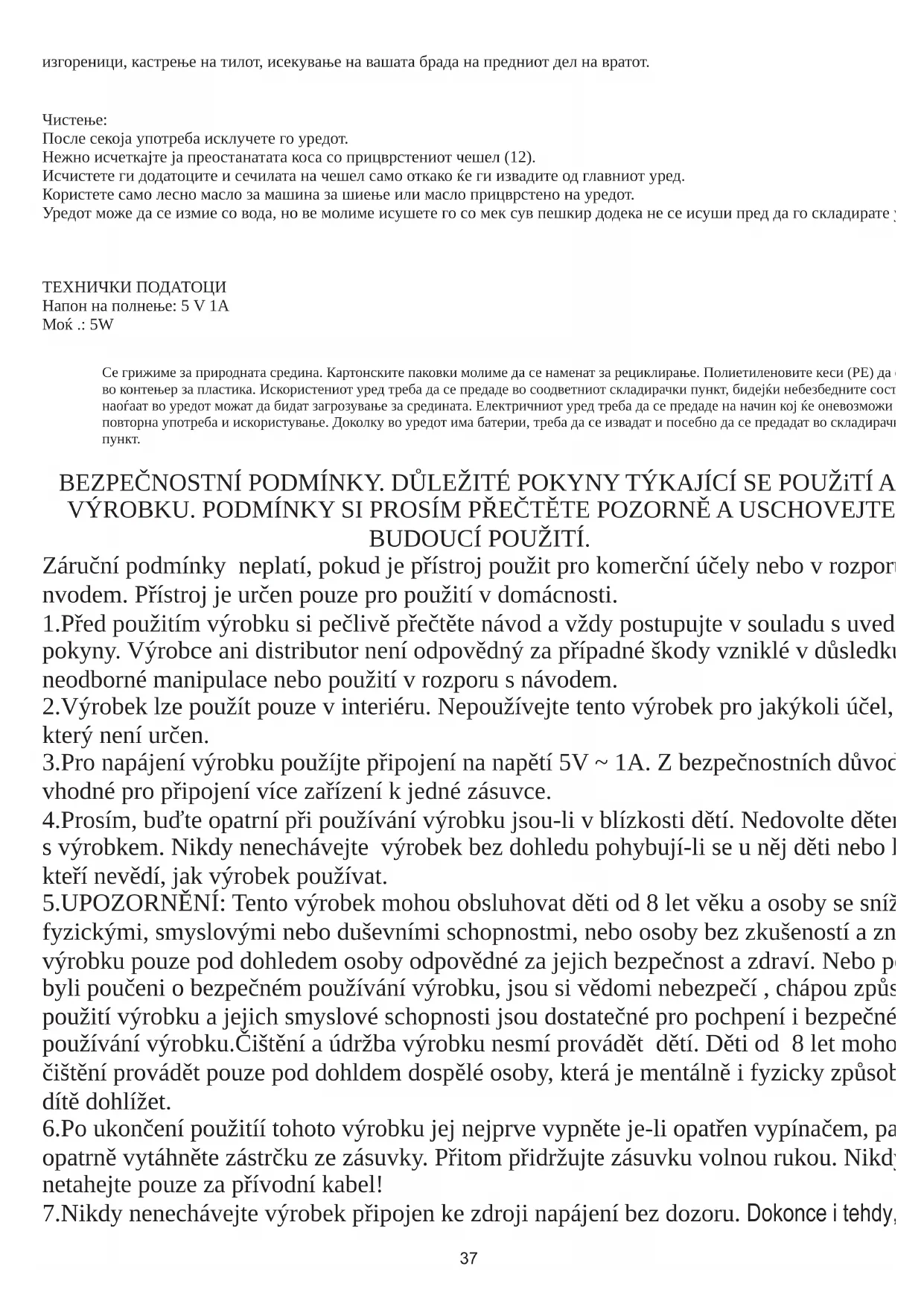 Vousy, knír a kotlety by měly být suché. Nepoužívejte krémy před použitím svého osobního zastřihovače. Učešte si vlasy ve směru jejich růstu. Odstraňte hřebenový nástavec zastřihovače, pokud: definujete okraje vlasů, jako jsou kotlety, zastřihujete šíji, zastřihujete linii vousů na přední straně krku. Čištění: Po každém použití vypněte zařízení. Zbývající vlasy jemně kartáčujte přiloženým hřebenem (12).40 Hřebenové nástavce a čepele čistěte až po vyjmutí z hlavního zařízení. Používejte pouze lehký olej do šicích strojů nebo olej připojený k zařízení. Zařízení lze umýt vodou, ale před uskladněním zařízení jej prosím osušte měkkým suchým ručníkem. TECHNICKÁ DATA Nabíjecí napětí: 5 V 1A Výkon .: 5W Staráme se o životní prostředí. Papírové obaly odevzdávejte do sběrných surovin. Polyetylenová balení (PE) vhazujte do odpadkových košů na plasty. Použité zařízení odevzdávejte do sběrného dvoru, protože se v něm mohou nacházet části, které jsou pro životní prostředí škodlivé nebo nebezpečné. Elektrospotřebiče odevzdávejte v takové podobě, aby bylo znemožněno jejich další použití. Pokud se v zařízení nacházejí baterie, vyjměte je a odevzdejte zvlášť. ΓΕΝΙΚΟΙ ΚΑΝΟΝΕΣ ΑΣΦΑΛΕΙΑΣ 1.Πριν από τη χρήση της συσκευής πρέπει να διαβάσετε τις οδηγίες χρήσεως και να τις ακολουθήσετε. Ο παραγωγός δεν ευθύνεται για ενδεχόμενες ζημιές που οφείλονται σε μη ενδεδειγμένη χρήση ή σε λάθος χειρισμό της συσκευής. 2.Η συσκευή προορίζεται για οικιακή χρήση. Απαγορεύεται η χρήση της για άλλους σκοπούς, για τους οποίους δεν προορίζεται. 3.Η συσκευή πρέπει να συνδεθεί μόνο με πρίζα 5 V ~ 1A . Για την μεγαλύτερη ασφάλειά σας δεν πρέπει να συνδέετε στον ίδιο κύκλωμα ρεύματος πολλές ηλεκτρικές συσκευές. 4.Πρέπει να προσέχετε ιδιαιτέρως κατά τη διάρκεια χρήσης της συσκευής όταν δίπλα βρίσκονται παιδιά. Δεν επιτρέπεται τα παιδιά να παίζουν με τη συσκευή. Δεν επιτρέπεται η χρήση της συσκευής από παιδιά ή άτομα που δεν έχουν ενημερωθεί σχετικά με το χειρισμό