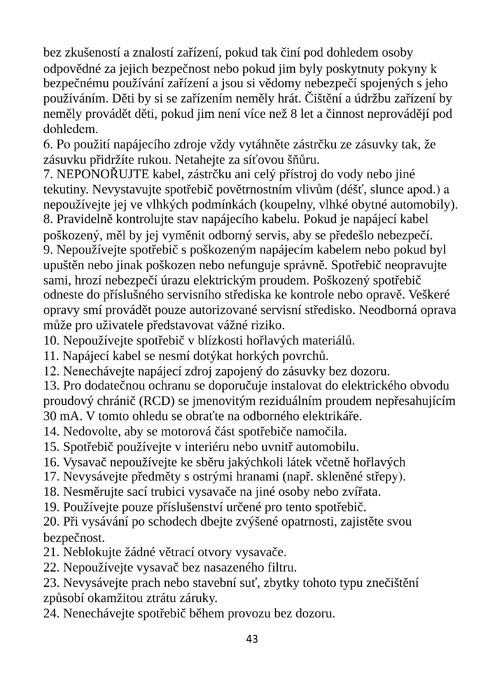 sníženými fyzickými, smyslovými nebo duševními schopnostmi nebo osoby43 bez zkušeností a znalostí zařízení, pokud tak činí pod dohledem osoby odpovědné za jejich bezpečnost nebo pokud jim byly poskytnuty pokyny k bezpečnému používání zařízení a jsou si vědomy nebezpečí spojených s jeho používáním. Děti by si se zařízením neměly hrát. Čištění a údržbu zařízení by neměly provádět děti, pokud jim není více než 8 let a činnost neprovádějí pod dohledem.