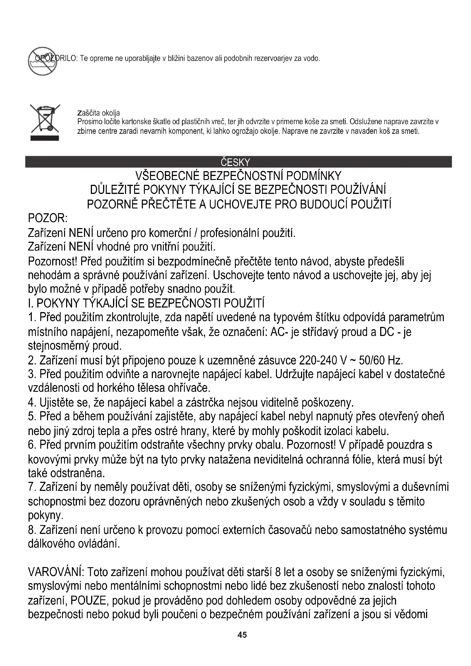 DŮLEŽITÉ POKYNY TÝKAJÍCÍ SE BEZPEČNOSTI POUŽÍVÁNÍ POZORNĚ PŘEČTĚTE A UCHOVEJTE PRO BUDOUCÍ POUŽITÍ POZOR: Zařízení NENÍ určeno pro komerční / profesionální použití. Zařízení NENÍ vhodné pro vnitřní použití. Pozornost! Před použitím si bezpodmínečně přečtěte tento návod, abyste předešli nehodám a správné používání zařízení. Uschovejte tento návod a uschovejte jej, aby jej bylo možné v případě potřeby snadno použít.