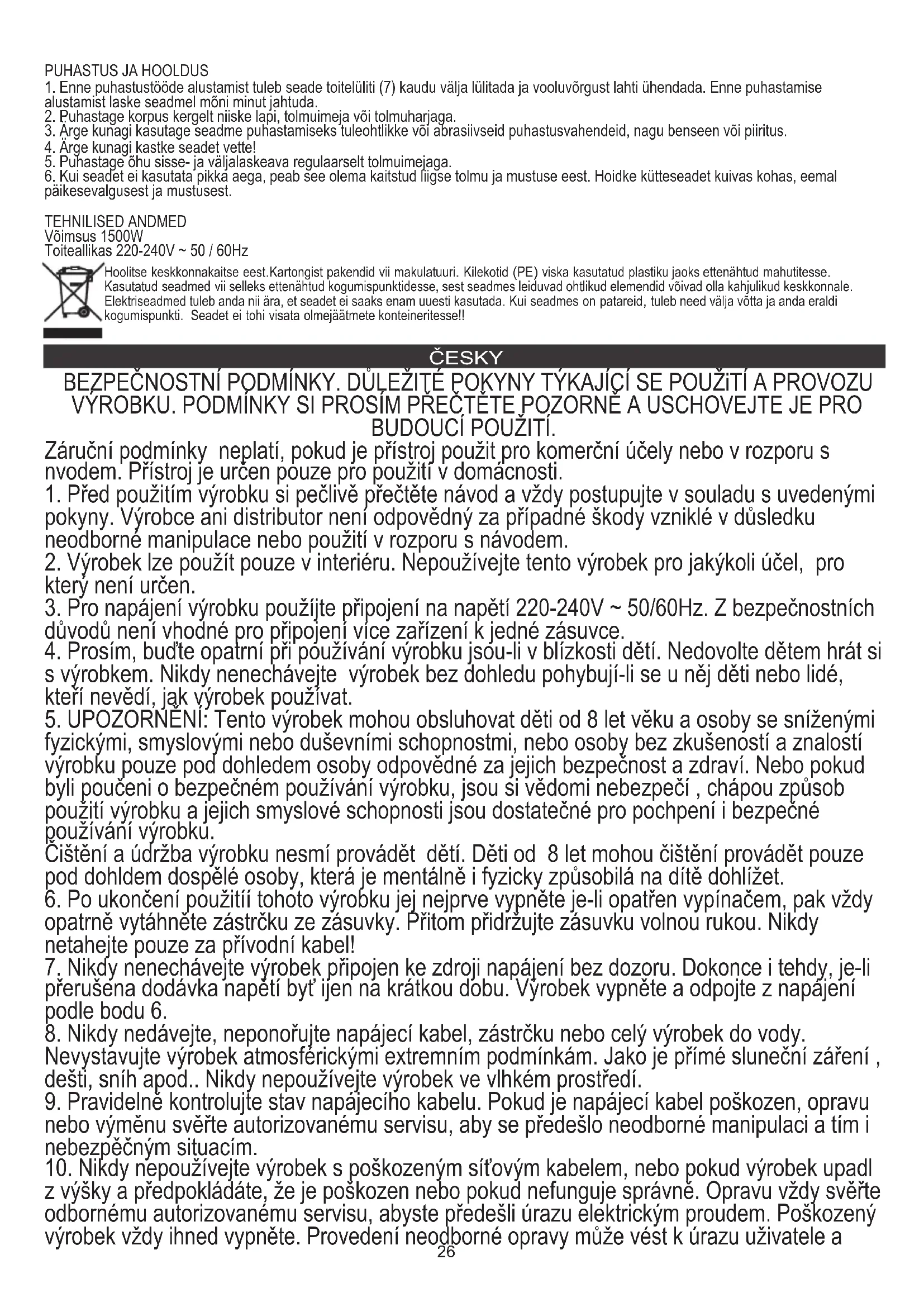 6. Pokud nebudete spotřebič delší dobu používat, musí být chráněn před nadměrným množstvím prachu a nečistot. Skladujte ohřívač na suchém místě mimo dosah slunečních paprsků a nečistot. TECHNICKÉ ÚDAJE Výkon 1 500 W. Napájení 220-240V ~ 50 / 60Hz Ochrana životního prostředí. Kartón odevzdejte do sběru. Polyetylénové sáčky (PE) vyhazujte do kontejneru na plasty. Vysloužilý přístroj odevzdejte do příslušného sběrného dvoru, protože některé části zařízení mohou představovat pro životní prostředí nebezpečí. Elektrický přístroj odevzdejte tak, aby se omezilo jeho opětovné používání. Pokud jsou v přístroji baterie, vyjměte je a odevzdejte do příslušného sběrného místa zvlášť. Přístroj nevyhazujte do popelnic ani kontejneru na směsný odpad!! MAGYAR A BIZTONSÁGRA VONATKOZÓ FONTOS UTASÍTÁSOK OLVASSA EL FIGYELMESEN, ÉS