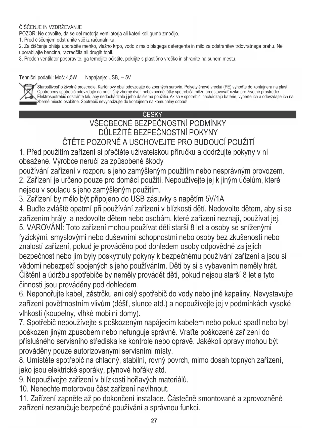 Technické údaje: Napájení: 4,5W Napájení: USB, ⎓ 5V Staráme se o životní prostředí. Papírové obaly odevzdávejte do sběrných surovin. Polyetylenová balení (PE) vhazujte do odpadkových košů na plasty. Použité zařízení odevzdávejte do sběrného dvoru, protože se v něm mohou nacházet části, které jsou pro životní prostředí škodlivé nebo nebezpečné. Elektrospotřebiče odevzdávejte v takové podobě, aby bylo znemožněno jejich další použití. Pokud se v zařízení nacházejí baterie, vyjměte je a odevzdejte zvlášť. DANSKI