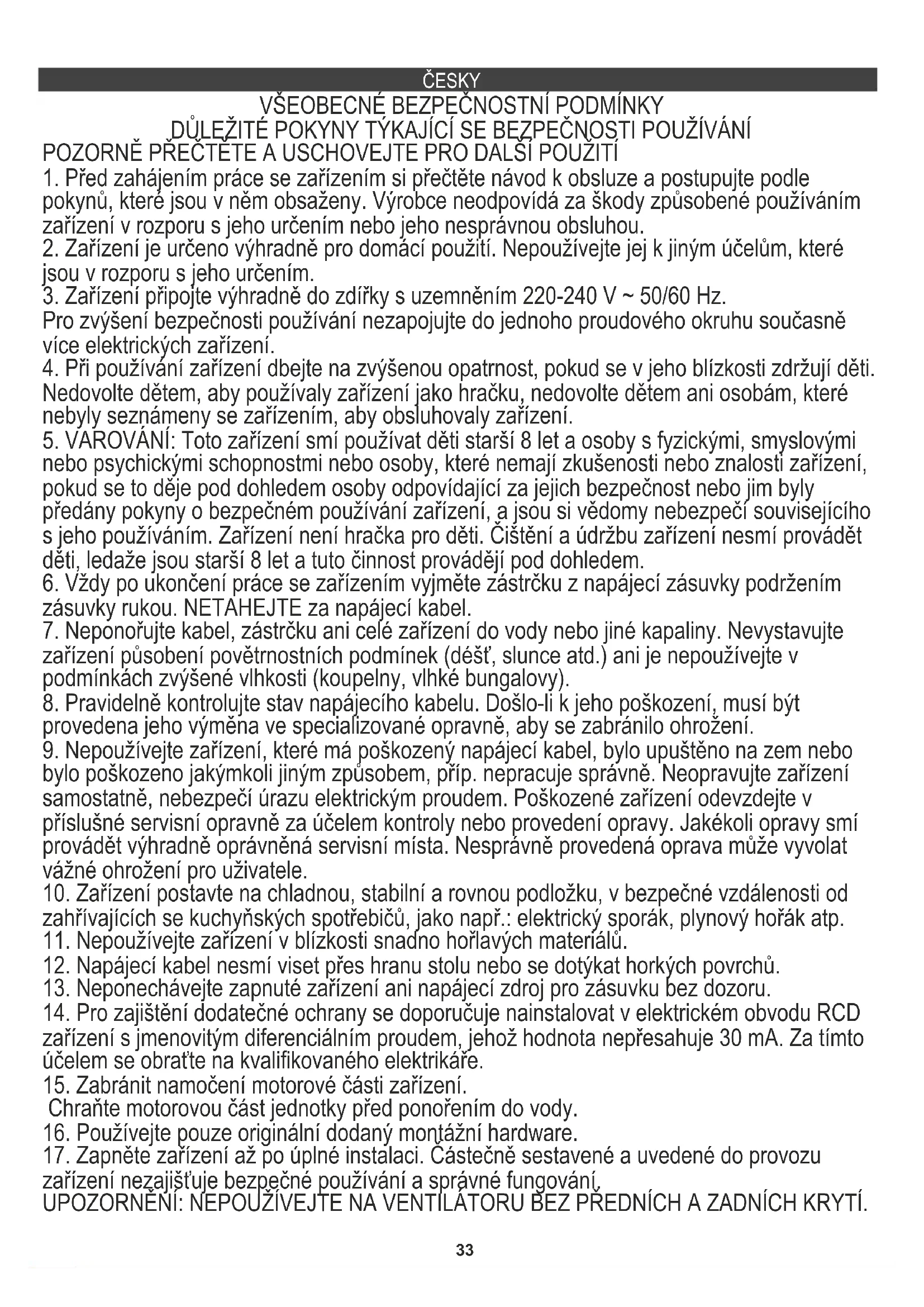 zařízení nezajišťuje bezpečné používání a správné fungování. UPOZORNĚNÍ: NEPOUŽÍVEJTE NA VENTILÁTORU BEZ PŘEDNÍCH A ZADNÍCH KRYTÍ.34