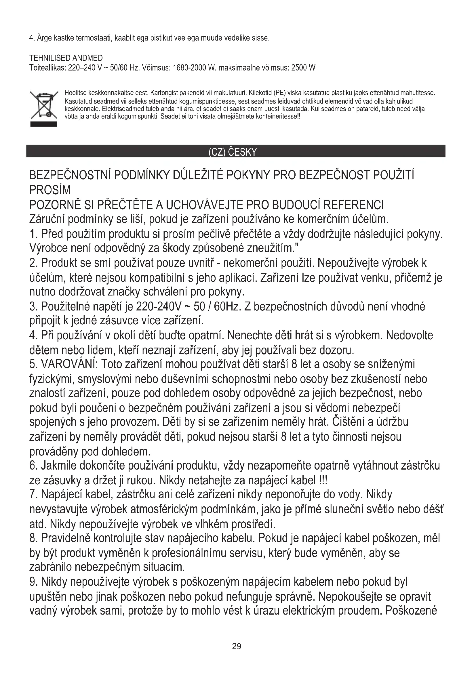 fyzickými, smyslovými nebo duševními schopnostmi nebo osoby bez zkušeností nebo znalostí zařízení, pouze pod dohledem osoby odpovědné za jejich bezpečnost, nebo pokud byli poučeni o bezpečném používání zařízení a jsou si vědomi nebezpečí spojených s jeho provozem. Děti by si se zařízením neměly hrát. Čištění a údržbu zařízení by neměly provádět děti, pokud nejsou starší 8 let a tyto činnosti nejsou prováděny pod dohledem.