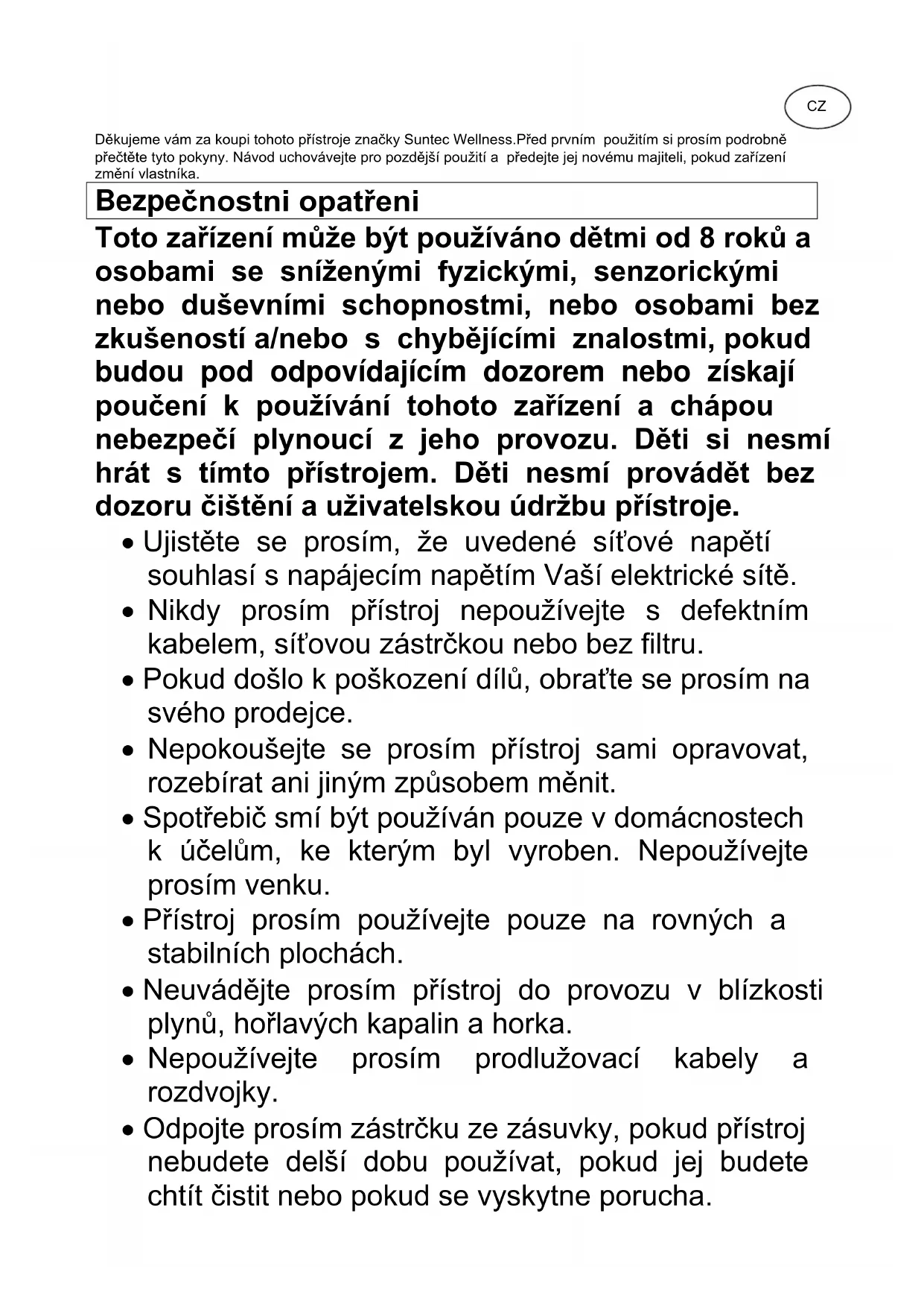 Děkujeme vám za koupi tohoto přístroje značky Suntec Wellness.Před prvním použitím si prosím podrobně přečtěte tyto pokyny. Návod uchovávejte pro pozdější použití a předejte jej novému majiteli, pokud zařízení změní vlastníka. Bezpe čnostni opatřeni Toto zařízení může být používáno dětmi od 8 roků a osobami se sníženými fyzickými, senzorickými nebo duševními schopnostmi, nebo osobami bez zkušeností a/nebo s chybějícími znalostmi, pokud budou pod odpovídajícím dozorem nebo získají poučení k používání tohoto zařízení a chápou nebezpečí plynoucí z jeho provozu. Děti si nesmí hrát s tímto přístrojem. Děti nesmí provádět bez dozoru čištění a uživatelskou údržbu přístroje.