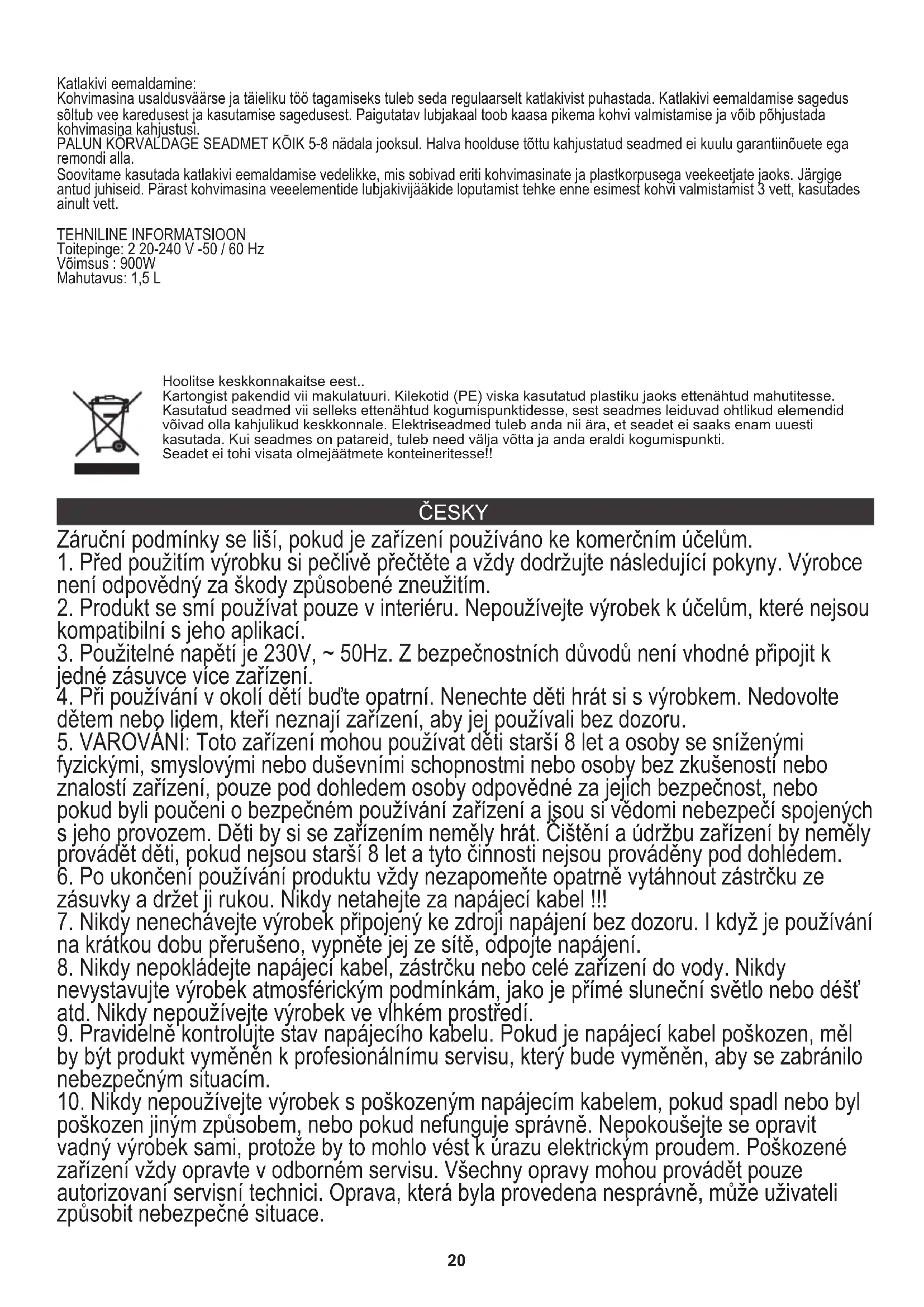 Odvápnění: Aby kávovar fungoval spolehlivě a byl plně efektivní, je třeba jej pravidelně odvápňovat. Četnost odstraňování vodního kamene závisí na tvrdosti vody a frekvenci používání. Usazenina vodního kamene vede k delší přípravě kávy a může vést k poškození kávovaru. ZA KAŽDÝCH 5-8 týdnů PROSÍM POPISUJTE ZAŘÍZENÍ. Zařízení poškozená špatnou údržbou nebudou mít nárok na záruční reklamace a opravy. Doporučujeme používat odvápňovací kapaliny vhodné zejména pro kávovary a konvice s plastovým krytem. Postupujte podle uvedených pokynů. Po opláchnutí usazenin vodního kamene z vodních prvků kávovaru proveďte před prvním vařením kávy 3 vaření s použitím pouze vody. TECHNICKÉ INFORMACE Napájecí napětí: 2 20 až 240 V ~ 50 /60 Hz Jmenovitý výkon : 900 W. Kapacita: 1,5 L