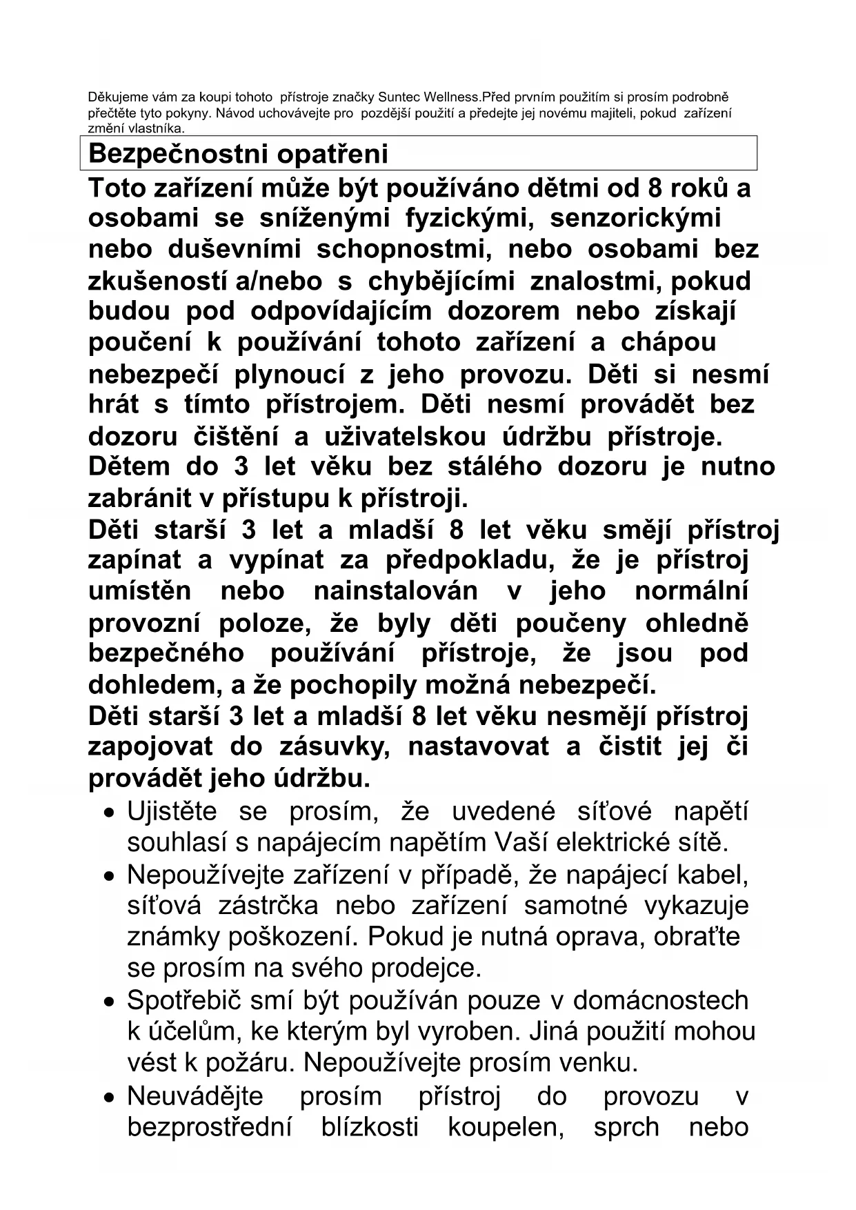 Návod k použitíDěkujeme vám za koupi tohoto přístroje značky Suntec Wellness.Před prvním použitím si prosím podrobně přečtěte tyto pokyny. Návod uchovávejte pro pozdější použití a předejte jej novému majiteli, pokud zařízení změní vlastníka. Bezpe čnostni opatřeni Toto zařízení může být používáno dětmi od 8 roků a osobami se sníženými fyzickými, senzorickými nebo duševními schopnostmi, nebo osobami bez zkušeností a/nebo s chybějícími znalostmi, pokud budou pod odpovídajícím dozorem nebo získají poučení k používání tohoto zařízení a chápou nebezpečí plynoucí z jeho provozu. Děti si nesmí hrát s tímto přístrojem. Děti nesmí provádět bez dozoru čištění a uživatelskou údržbu přístroje. Dětem do 3 let věku bez stálého dozoru je nutno zabránit v přístupu k přístroji. Děti starší 3 let a mladší 8 let věku smějí přístroj zapínat a vypínat za předpokladu, že je přístroj umístěn nebo nainstalován v jeho normální provozní poloze, že byly děti poučeny ohledně bezpečného používání přístroje, že jsou pod dohledem, a že pochopily možná nebezpečí. Děti starší 3 let a mladší 8 let věku nesmějí přístroj zapojovat do zásuvky, nastavovat a čistit jej či provádět jeho údržbu.