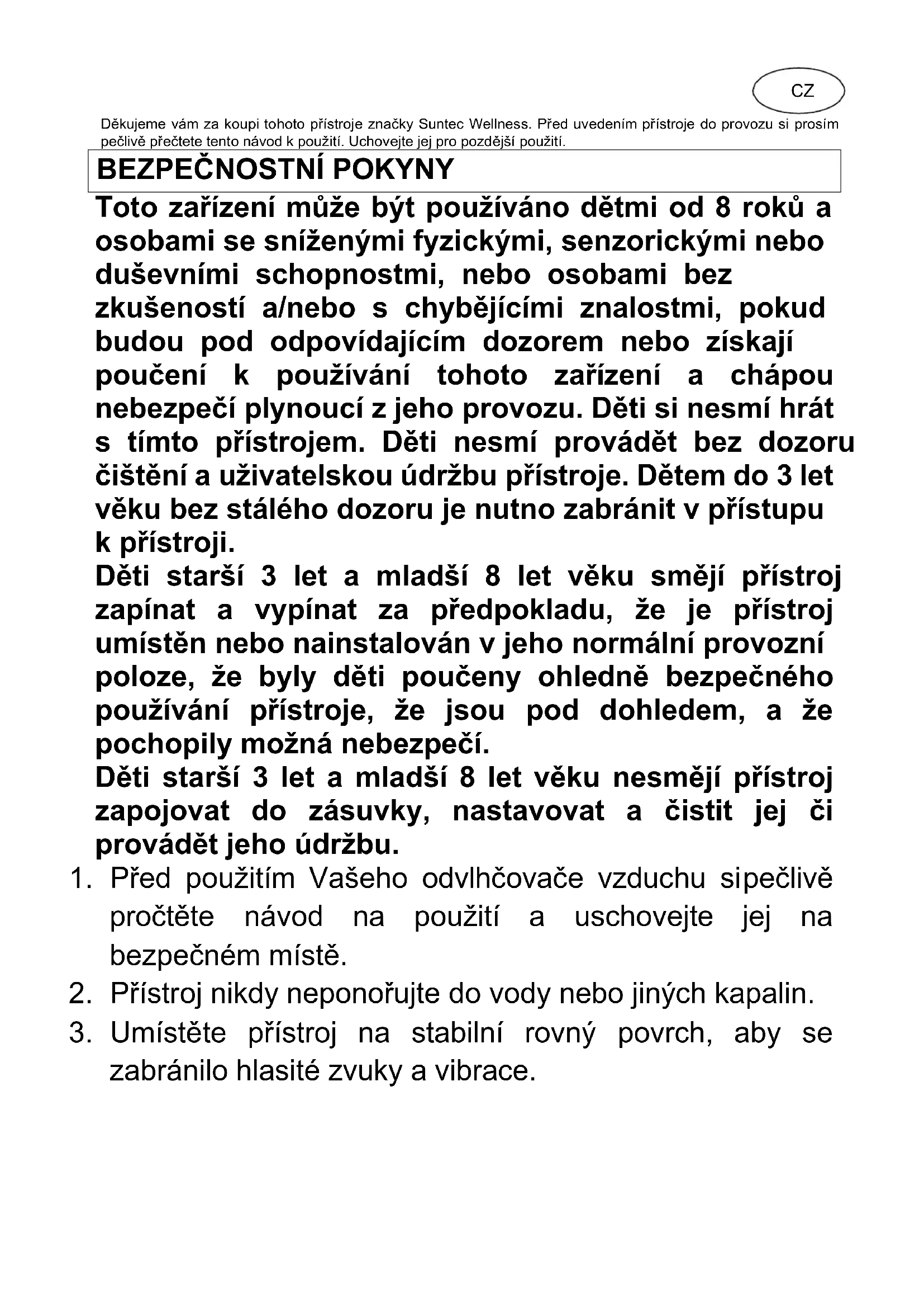 DryFix 30 select APP SUNTEC WELLNESS GMBH / HOLZSTRASSE 2 / 40221 DÜSSELDORF / GERMANYDěkujeme vám za koupi tohoto přístroje značky Suntec Wellness. Před uvedením přístroje do provozu si prosím pečlivě přečtete tento návod k použití. Uchovejte jej pro pozdější použití. Toto zařízení může být používáno dětmi od 8 roků a osobami se sníženými fyzickými, senzorickými nebo duševními schopnostmi, nebo osobami bez zkušeností a/nebo s chybějícími znalostmi, pokud budou pod odpovídajícím dozorem nebo získají poučení k používání tohoto zařízení a chápou nebezpečí plynoucí z jeho provozu. Děti si nesmí hrát s tímto přístrojem. Děti nesmí provádět bez dozoru čištění a uživatelskou údržbu přístroje. Dětem do 3 let věku bez stálého dozoru je nutno zabránit v přístupu k přístroji. Děti starší 3 let a mladší 8 let věku smějí přístroj zapínat a vypínat za předpokladu, že je přístroj umístěn nebo nainstalován v jeho normální provozní poloze, že byly děti poučeny ohledně bezpečného používání přístroje, že jsou pod dohledem, a že pochopily možná nebezpečí. Děti starší 3 let a mladší 8 let věku nesmějí přístroj zapojovat do zásuvky, nastavovat a čistit jej či provádět jeho údržbu.