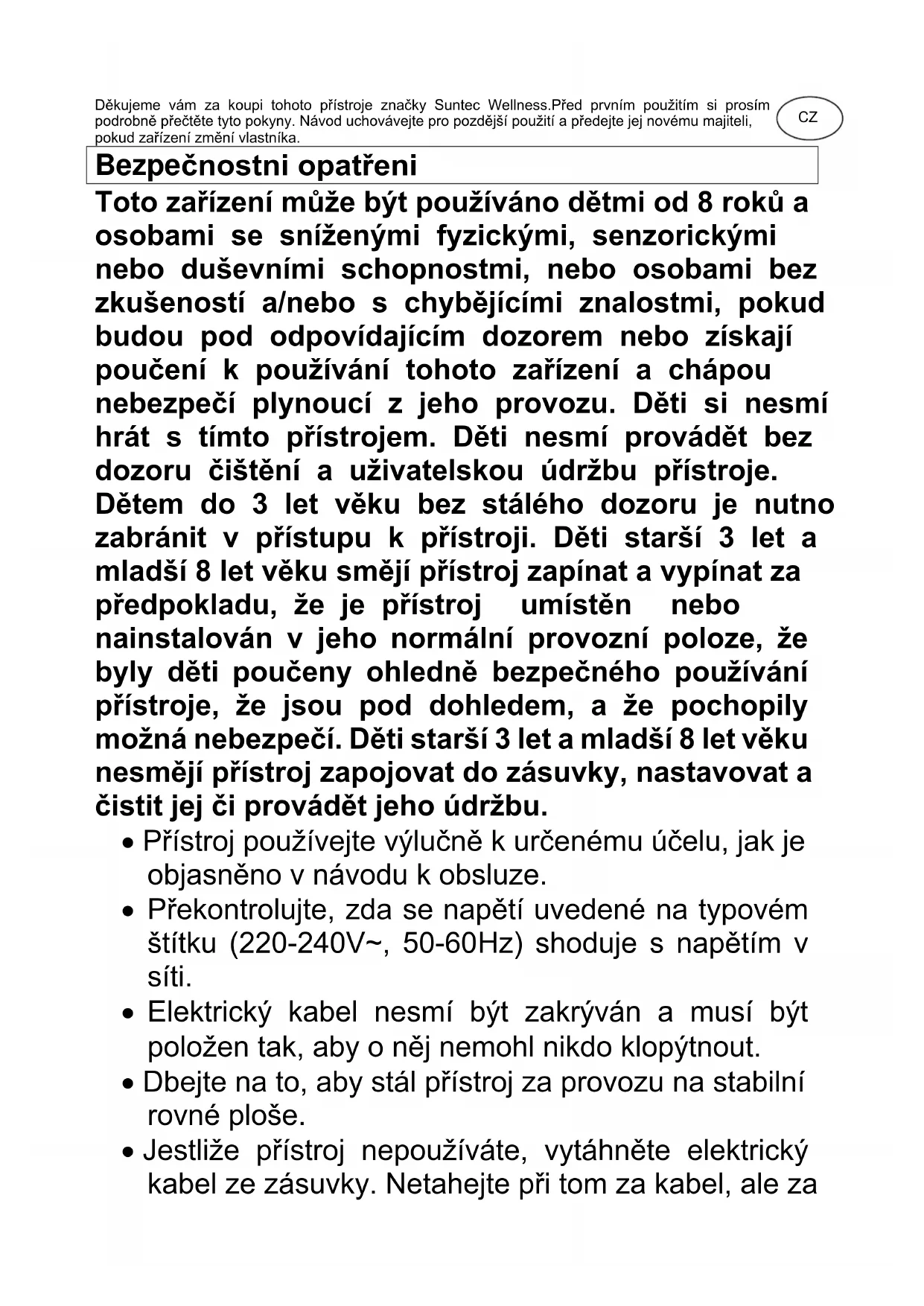 CoolBreeze SUNTEC WELLNESS GMBH / HOLZSTRASSE 2 / 40 221 DÜSSELDORF / GERMANYDěkujeme vám za koupi tohoto přístroje značky Suntec Wellness.Před prvním použitím si prosím podrobně přečtěte tyto pokyny. Návod uchovávejte pro pozdější použití a předejte jej novému majiteli, pokud zařízení změní vlastníka. Bezpe čnostni opatřeni Toto zařízení může být používáno dětmi od 8 roků a osobami se sníženými fyzickými, senzorickými nebo duševními schopnostmi, nebo osobami bez zkušeností a/nebo s chybějícími znalostmi, pokud budou pod odpovídajícím dozorem nebo získají poučení k používání tohoto zařízení a chápou nebezpečí plynoucí z jeho provozu. Děti si nesmí hrát s tímto přístrojem. Děti nesmí provádět bez dozoru čištění a uživatelskou údržbu přístroje. Dětem do 3 let věku bez stálého dozoru je nutno zabránit v přístupu k přístroji. Děti starší 3 let a mladší 8 let věku smějí přístroj zapínat a vypínat za předpokladu, že je přístroj umístěn nebo nainstalován v jeho normální provozní poloze, že byly děti poučeny ohledně bezpečného používání přístroje, že jsou pod dohledem, a že pochopily možná nebezpečí. Děti starší 3 let a mladší 8 let věku nesmějí přístroj zapojovat do zásuvky, nastavovat a čistit jej či provádět jeho údržbu.
