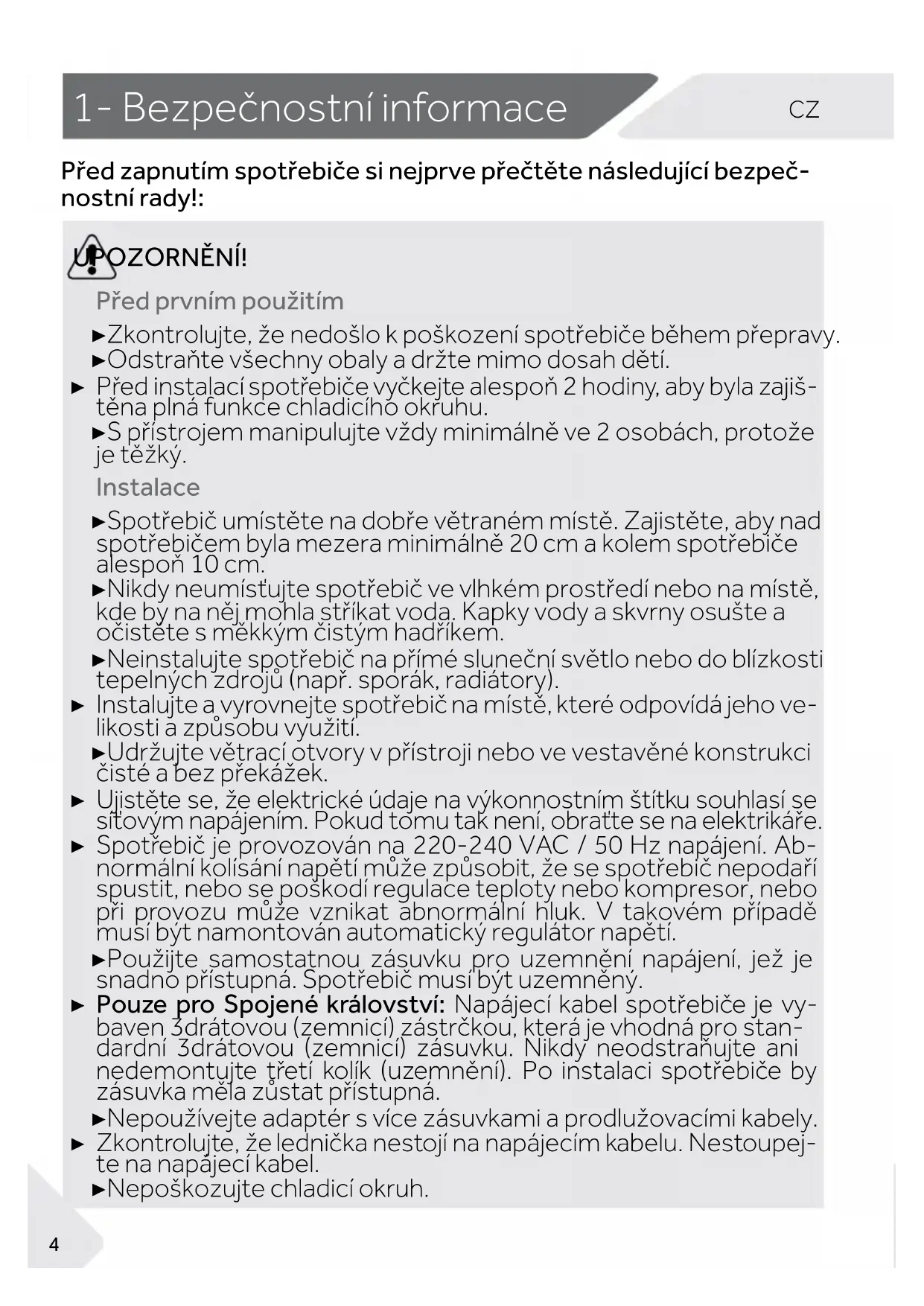 Před zapnutím spotřebiče si nejprve přečtěte následující bezpeč- nostní rady!: UPOZORNĚNÍ! Před prvním použitím ▶ Zkontrolujte, že nedošlo k poškození spotřebiče během přepravy. ▶ Odstraňte všechny obaly a držte mimo dosah dětí. ▶ Před instalací spotřebiče vyčkejte alespoň 2 hodiny, aby byla zajiš- těna plná funkce chladicího okruhu. ▶ S přístrojem manipulujte vždy minimálně ve 2 osobách, protože je těžký. Instalace ▶ Spotřebič umístěte na dobře větraném místě. Zajistěte, aby nad spotřebičem byla mezera minimálně 20 cm a kolem spotřebiče alespoň 10 cm. ▶ Nikdy neumísťujte spotřebič ve vlhkém prostředí nebo na místě, kde by na něj mohla stříkat voda. Kapky vody a skvrny osušte a očistěte s měkkým čistým hadříkem. ▶ Neinstalujte spotřebič na přímé sluneční světlo nebo do blízkosti tepelných zdrojů (např. sporák, radiátory). ▶ Instalujte a vyrovnejte spotřebič na místě, které odpovídá jeho ve- likosti a způsobu využití. ▶ Udržujte větrací otvory v přístroji nebo ve vestavěné konstrukci čisté a bez překážek. ▶ Ujistěte se, že elektrické údaje na výkonnostním štítku souhlasí se síťovým napájením. Pokud tomu tak není, obraťte se na elektrikáře. ▶ Spotřebič je provozován na 220-240 VAC / 50 Hz napájení. Ab- normální kolísání napětí může způsobit, že se spotřebič nepodaří spustit, nebo se poškodí regulace teploty nebo kompresor, nebo při provozu může vznikat abnormální hluk. V takovém případě musí být namontován automatický regulátor napětí. ▶ Použijte samostatnou zásuvku pro uzemnění napájení, jež je snadno přístupná. Spotřebič musí být uzemněný. ▶ Pouze pro Spojené království: Napájecí kabel spotřebiče je vy- baven 3drátovou (zemnicí) zástrčkou, která je vhodná pro stan- dardní 3drátovou (zemnicí) zásuvku. Nikdy neodstraňujte ani nedemontujte třetí kolík (uzemnění). Po instalaci spotřebiče by zásuvka měla zůstat přístupná. ▶ Nepoužívejte adaptér s více zásuvkami a prodlužovacími kabely. ▶ Zkontrolujte, že lednička nestojí na napájecím kabelu. Nestoupej- te na napájecí kabel. ▶ Nepoškozujte chladicí okruh. 4CZ