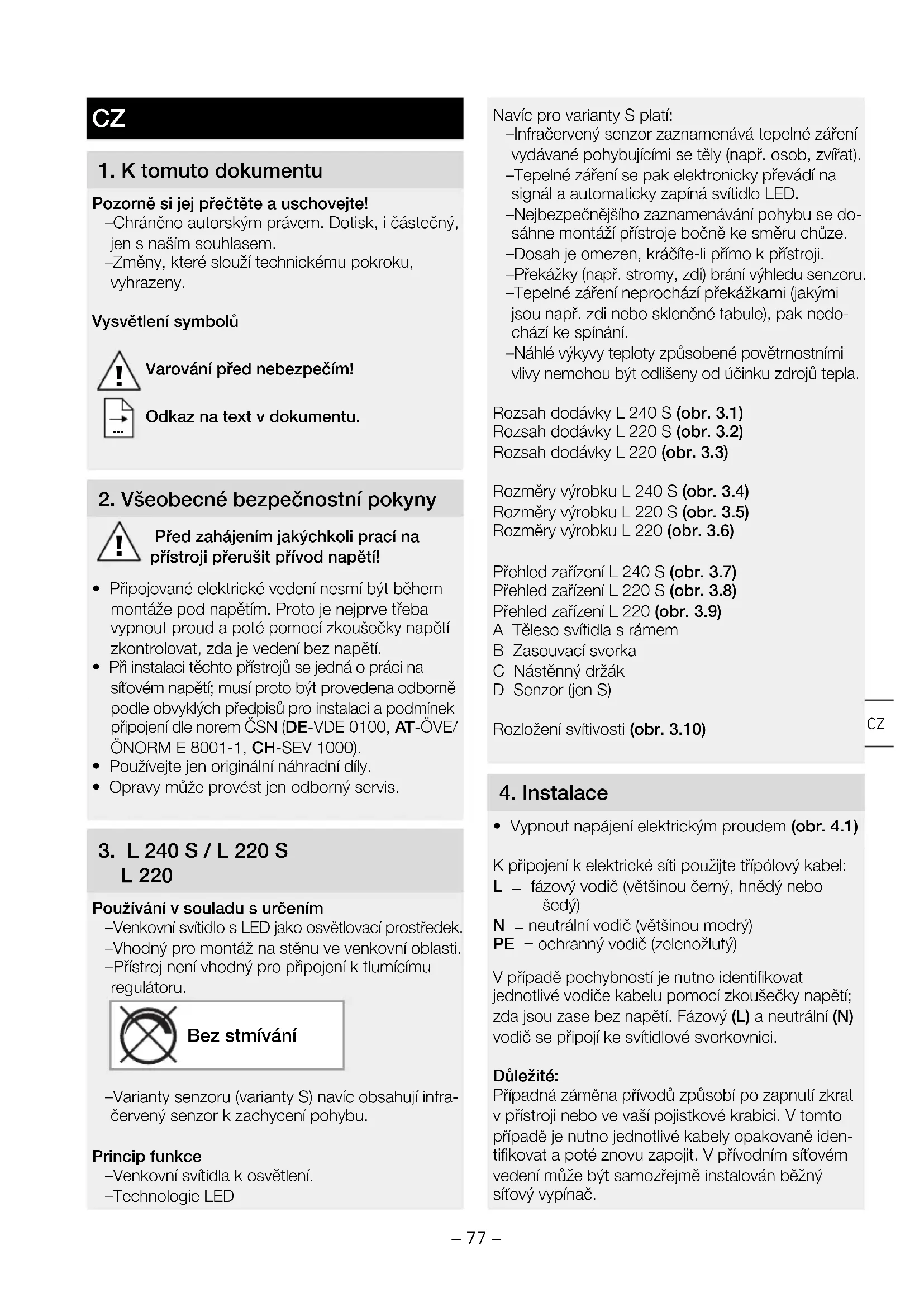 L 220 Používání vsouladu surčením – Venkovní svítidlo sLED jako osvětlovací prostředek. – Vhodný pro montáž na stěnu ve venkovní oblasti. – Přístroj není vhodný pro připojení ktlumícímu regulátoru. Bez stmívání – Varianty senzoru (varianty S) navíc obsahují infra- červený senzor k zachycení pohybu. Princip funkce – Venkovní svítidla k osvětlení. – Technologie LED Navíc pro varianty S platí: – Infračervený senzor zaznamenává tepelné záření vydávané pohybujícími se těly (např. osob, zvířat). – Tepelné záření se pak elektronicky převádí na signál a automaticky zapíná svítidlo LED. – Nejbezpečnějšího zaznamenávání pohybu se do- sáhne montáží přístroje bočně ke směru chůze. – Dosah je omezen, kráčíte-li přímo kpřístroji. – Překážky (např. stromy, zdi) brání výhledu senzoru. – Tepelné záření neprochází překážkami (jakými jsou např. zdi nebo skleněné tabule), pak nedo- chází ke spínání. – Náhlé výkyvy teploty způsobené povětrnostními vlivy nemohou být odlišeny od účinku zdrojů tepla. Rozsah dodávky L 240 S (obr. 3.1) Rozsah dodávky L 220 S (obr. 3.2) Rozsah dodávky L 220 (obr. 3.3) Rozměry výrobku L 240 S (obr. 3.4) Rozměry výrobku L 220 S (obr. 3.5) Rozměry výrobku L 220 (obr. 3.6) Přehled zařízení L 240 S (obr. 3.7) Přehled zařízení L 220 S (obr. 3.8) Přehled zařízení L 220 (obr. 3.9) A Těleso svítidla srámem B Zasouvací svorka C Nástěnný držák D Senzor (jen S) Rozložení svítivosti (obr. 3.10)