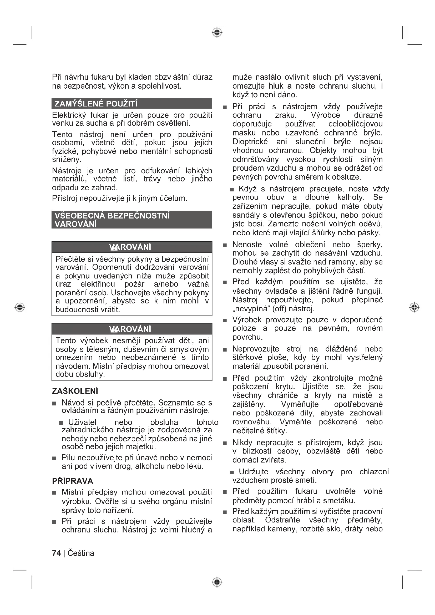 VAROVÁNÍ VAROVÁNÍ Přečtěte si všechny pokyny a bezpečnostní varování. Opomenutí dodržování varování a pokynů uvedených níže může způsobit úraz elektřinou požár a/nebo vážná poranění osob. Uschovejte všechny pokyny a upozornění, abyste se k nim mohli v budoucnosti vrátit. VAROVÁNÍ Tento výrobek nesmějí používat děti, ani osoby s tělesným, duševním či smyslovým omezením nebo neobeznámené s tímto návodem. Místní předpisy mohou omezovat dobu obsluhy. ZAŠKOLENÍ ■ Návod si pečlivě přečtěte. Seznamte se s ovládáním a řádným používáním nástroje. ■ Uživatel nebo obsluha tohoto zahradnického nástroje je zodpovědná za nehody nebo nebezpečí způsobená na jiné osobě nebo jejich majetku. ■ Pilu nepoužívejte při únavě nebo v nemoci ani pod vlivem drog, alkoholu nebo léků. PŘÍPRAVA ■ Místní předpisy mohou omezovat použití výrobku. Ověřte si u svého orgánu místní správy toto nařízení. ■ Při práci s nástrojem vždy používejte ochranu sluchu. Nástroj je velmi hlučný a může nastálo ovlivnit sluch při vystavení, omezujte hluk a noste ochranu sluchu, i když to není dáno. ■ Při práci s nástrojem vždy používejte ochranu zraku. Výrobce důrazně doporučuje používat celoobličejovou masku nebo uzavřené ochranné brýle. Dioptrické ani sluneční brýle nejsou vhodnou ochranou. Objekty mohou být odmršťovány vysokou rychlostí silným proudem vzduchu a mohou se odrážet od pevných povrchů směrem k obsluze. ■ Když s nástrojem pracujete, noste vždy pevnou obuv a dlouhé kalhoty. Se zařízením nepracujte, pokud máte obuty sandály s otevřenou špičkou, nebo pokud jste bosi. Zamezte nošení volných oděvů, nebo které mají vlající šňůrky nebo pásky. ■ Nenoste volné oblečení nebo šperky, mohou se zachytit do nasávání vzduchu. Dlouhé vlasy si svažte nad rameny, aby se nemohly zaplést do pohyblivých částí. ■ Před každým použitím se ujistěte, že všechny ovladače a jištění řádně fungují. Nástroj nepoužívejte, pokud přepínač „nevypíná“ (off) nástroj. ■ Výrobek provozujte pouze v doporučené poloze a pouze na pevném, rovném povrchu. ■ Neprovozujte stroj na dlážděné nebo štěrkové ploše, kdy by mohl vystřelený materiál způsobit poranění. ■ Před použitím vždy zkontrolujte možné poškození krytu. Ujistěte se, že jsou všechny chrániče a kryty na místě a zajištěny. Vyměňujte opotřebované nebo poškozené díly, abyste zachovali rovnováhu. Vyměňte poškozené nebo nečitelné štítky. ■ Nikdy nepracujte s přístrojem, když jsou v blízkosti osoby, obzvláště děti nebo domácí zvířata. ■ Udržujte všechny otvory pro chlazení vzduchem prosté smetí. ■ Před použitím fukaru uvolněte volné předměty pomocí hrábí a smetáku. ■ Před každým použitím si vyčistěte pracovní oblast. Odstraňte všechny předměty, například kameny, rozbité sklo, dráty nebo75 Čeština |