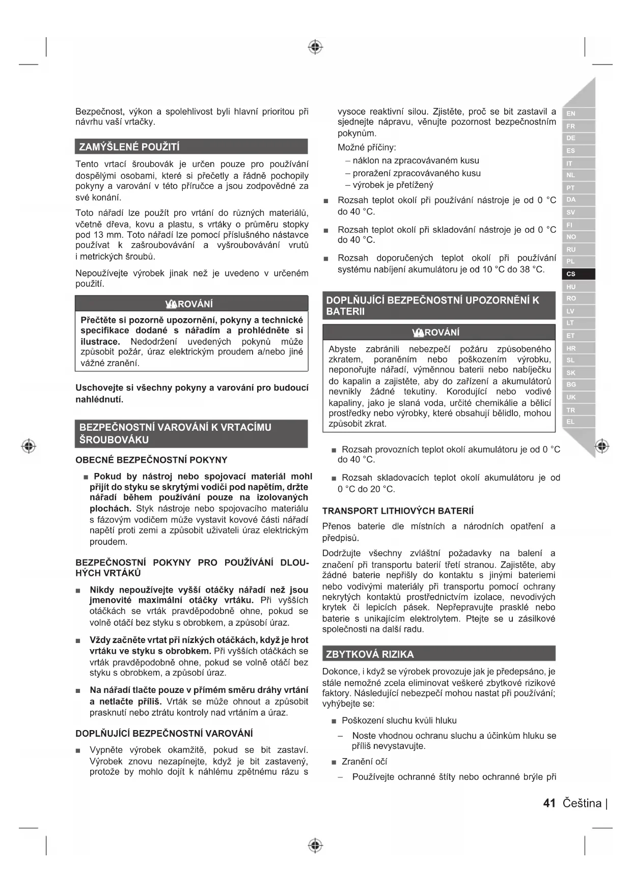 ■ Nikdy nepoužívejte vyšší otáčky nářadí než jsou jmenovité maximální otáčky vrtáku. Při vyšších otáčkách se vrták pravděpodobně ohne, pokud se volně otáčí bez styku s obrobkem, a způsobí úraz. ■ Vždy začněte vrtat při nízkých otáčkách, když je hrot vrtáku ve styku s obrobkem. Při vyšších otáčkách se vrták pravděpodobně ohne, pokud se volně otáčí bez styku s obrobkem, a způsobí úraz. ■ Na nářadí tlačte pouze v přímém směru dráhy vrtání a netlačte příliš. Vrták se může ohnout a způsobit prasknutí nebo ztrátu kontroly nad vrtáním a úraz. DOPLŇUJÍCÍ BEZPEČNOSTNÍ VAROVÁNÍ ■ Vypněte výrobek okamžitě, pokud se bit zastaví. Výrobek znovu nezapínejte, když je bit zastavený, protože by mohlo dojít k náhlému zpětnému rázu s vysoce reaktivní silou. Zjistěte, proč se bit zastavil a sjednejte nápravu, věnujte pozornost bezpečnostním pokynům. Možné příčiny: – náklon na zpracovávaném kusu – proražení zpracovávaného kusu – výrobek je přetížený ■ Rozsah teplot okolí při používání nástroje je od 0 °C do 40 °C. ■ Rozsah teplot okolí při skladování nástroje je od 0 °C do 40 °C. ■ Rozsah doporučených teplot okolí při používání systému nabíjení akumulátoru je od 10 °C do 38 °C. DOPLŇUJÍCÍ BEZPEČNOSTNÍ UPOZORNĚNÍ K BATERII VAROVÁNÍ Abyste zabránili nebezpečí požáru způsobeného zkratem, poraněním nebo poškozením výrobku, neponořujte nářadí, výměnnou baterii nebo nabíječku do kapalin a zajistěte, aby do zařízení a akumulátorů nevnikly žádné tekutiny. Korodující nebo vodivé kapaliny, jako je slaná voda, určité chemikálie a bělicí prostředky nebo výrobky, které obsahují bělidlo, mohou způsobit zkrat. ■ Rozsah provozních teplot okolí akumulátoru je od 0 °C do 40 °C. ■ Rozsah skladovacích teplot okolí akumulátoru je od 0 °C do 20 °C.