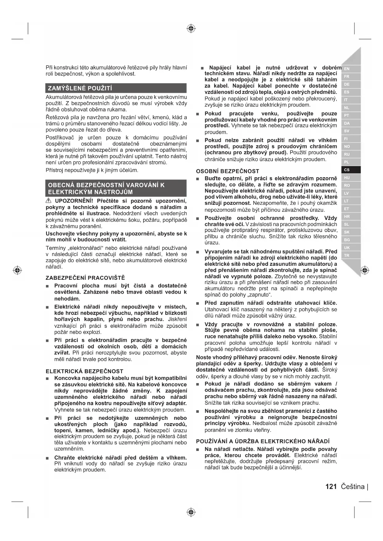 ■ Udržujte všechny části těla v dostatečné vzdálenosti od řetězu, když řetězová pila pracuje. Před spuštěním řetězové pily zkontrolujte, zda se řetěz pily nedotýká žádného předmětu. Chvíle nepozornosti při práci s řetězovou pilou může způsobit zamotání vašeho oděvu nebo těla do řetězu pily. ■ Vždy držte řetězovou pilu pravou rukou na zadní rukojeti a levou rukou na přední rukojeti. Držení řetězové pily v opačném umístění rukou se zvyšuje nebezpečí poranění osob a nemělo by se nikdy používat. ■ Pilu držte pouze na izolovaných plochách, protože její řetěz může přijít do styku se skrytými vodiči. Kontakt pilového řetězu s „živým“ vodičem způsobí, že kovové části elektrického nástroje se stanou také „živými“ a způsobí elektrický úraz obsluze. ■ Noste ochranu očí Je doporučeno používat prostředky na ochranu sluchu, hlavy, rukou a nohou. Odpovídající ochranné prostředky snižují riziko úrazu od odletujících odřezků a náhodného styku s řetězem pily. ■ Pilu nepoužívejte, pokud jste na stromě, na žebříku, na střeše nebo na jiné nestabilní opoře. Používání pily tímto způsobem může způsobit vážný úraz. ■ Vždy udržujte řádné postavení a obsluhujte pilu pouze při postavení na pevné, bezpečné a rovné ploše. Kluzký nebo nestabilní povrch může způsobit ztrátu rovnováhy nebo kontroly nad pilou. ■ Když řežete větev, která je napnuta, buďte ve střehu před zpětným švihem. Pokud se uvolní pnutí ve vláknech dřeva může napružená větev udeřit obsluhu anebo způsobit ztrátu kontroly nad řetězovou pilou. ■ Buďte velmi opatrní při řezání malých větviček a křovin. Mohou se zachytit o zuby řetězu a být vymrštěny směrem k vám a narušit tak vaši rovnováhu. ■ Noste řetězovou pilu za přední rukojeť ve vypnutém stavu a směrem od vašeho těla. Pokud řetězovou pilu přepravujete nebo ukládáte, vždy připevněte kryt vodící lišty. Správné držení řetězové pily sníží pravděpodobnost náhodného dotyku s pohybujícím se řetězem pily. 122 | Čeština■ Dodržujte pokyny k promazávání, napínání řetězu a výměně lišty a řetězu. Nesprávně upnutý nebo namazaný řetěz může buď způsobit nebo zvýšit zpětný vrh. ■ Řezejte pouze dřevo. Nepoužívejte řetězovou pilu pro účely, pro které nebyla navržena. Například nepoužívejte pilu k řezání kovů, plastů, zdiva neboli nedřevěných stavebních materiálů. Použití řetězové pily pro práce jiné, než zamýšlené, by mohlo mít za následek nebezpečnou situaci. ■ Neporážejte strom, dokud neznáte všechna související rizika a způsob jejich odstranění. Při kácení stromu může dojít k úrazu obsluhy pily nebo přihlížejících osob. ■ Při odstraňování zachyceného materiálu, skladování a provádění servisu dodržujte všechny pokyny. Vypínač musí být v poloze vypnuto a vyjmuta baterie. Náhodné spuštění pily během odstraňování zachyceného materiálu nebo provádění servisu může způsobit úraz. PŘÍČINY A PREVENCE ZPĚTNÉMU VRHU: Pokud konec vodící lišty narazí na cizí předmět nebo dojde k zablokování řetězu při řezání, existuje nebezpečí zpětnéhu vrhu. Dotyk vrcholem vodící lišty může v některých případech způsobit náhlou zpětnou reakci, což je vyhození vodící lišty nahoru a zpět směrem k obsluze. Sevření řetězu pily na horní části vodící lišty může vodící lištu rychle zatlačit zpět směrem k obsluze. Ve všech uvedených případech může obsluha pily ztratit kontrolu nad nářadím a způsobit si vážný úraz. Nespoléhejte pouze na ochranné prvky řetězové pily. Při obsluze řetězové pily je třeba dodržovat opatření k zajištění bezpečností a ochrany zdraví při práci. Zpětný vrh je následkem nesprávného používání nástroje anebo nesprávných pracovních postupů nebo podmínek a lze se jim vyhnout prováděním správných opatření, viz níže: ■ Udržujte pevný úchop, palce a prsty obepínají rukojeti řetězové pily, oběma rukama na řetězové pile a rozestavte své tělo a ruce tak, abyste odolávali silám zpětného vrhu. Síly zpětného vrhu mohou být ovládány obsluhou, pokud provede správná opatření. Řetězovou pilu neopouštějte. ■ Nepřeceňujte se a neřežte nad úrovní ramen. Toto pomáhá zabránit neúmyslnému kontaktu s vrcholem vodící lišty a umožňuje lepší ovládání řetězové pily v neočekávaných situacích. ■ Používejte pouze náhradní vodicí lišty a pilové řetězy určené výrobcem. Nesprávná vodicí lišta nebo pilový řetěz může způsobit přetržení řetězu nebo zpětný náraz. ■ Dodržujte pokyny výrobce při ostření a údržbě řetězu. Zmenšení výšky hloubkoměru může vést ke zvýšenému zpětnému vrhu. DOPLŇUJÍCÍ BEZPEČNOSTNÍ VAROVÁNÍ ■ Absolvujte odborně vedený kurz používání a údržby řetězových pil, preventivních opatření a poskytování první pomoci. Tyto pokyny uschovejte pro příští použití. ■ Řetězové pily jsou velmi nebezpečné nástroje. Nehody způsobené používáním řetězové pily často končí ztrátou končetiny či smrtí. Padající větve, kácené stromy i odvalující se polena mohou usmrtit. Napadené nebo shnilé dřevo představuje další nebezpečí. Měli byste zhodnotit své schopnosti k bezpečnému dokončení úkolu. V případě pochyb neváhejte profesionální dřevorubce. ■ Neodřezávejte výhonky ani křoviny s malým průměrem (do 75 mm). ■ Při prvním použití pily se doporučuje nácvik řezání polen na „koze“ nebo podpěrném stojanu. ■ Plocha pracovní zóny závisí na povaze práce, na velikosti stromu nebo řezaného materiálu. např. při kácení s