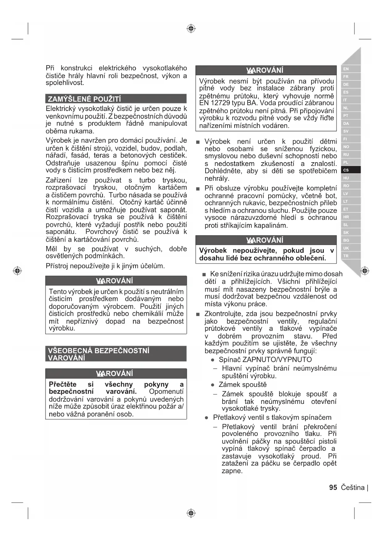Pri nesprávném použiti muze byt vysokotláký proud nebezpečné. Proud nesmite miřit na lidi, zviřata, elektrická zařizení ani na samotné vyrobek.