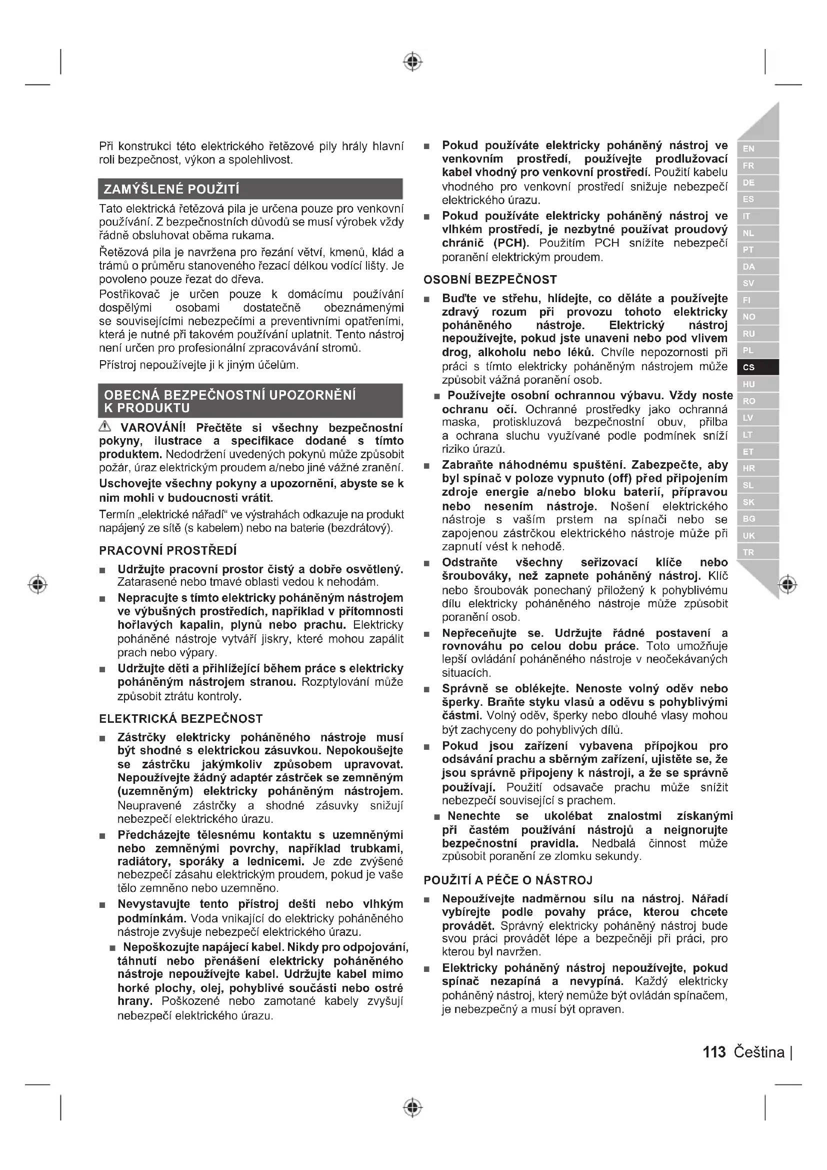 ■ Udržujte všechny části těla v dostatečné vzdálenosti od řetězu, když řetězová pila pracuje. Před spuštěním řetězové pily zkontrolujte, zda se řetěz pily nedotýká žádného předmětu. Chvíle nepozornosti při práci s řetězovou pilou může způsobit zamotání vašeho oděvu nebo těla do řetězu pily. ■ Vždy držte řetězovou pilu pravou rukou na zadní rukojeti a levou rukou na přední rukojeti. Držení řetězové pily v opačném umístění rukou se zvyšuje nebezpečí poranění osob a nemělo by se nikdy používat. ■ Pilu držte pouze na izolovaných plochách, protože její řetěz může přijít do styku se skrytými vodiči nebo s vlastním napájecím přívodem. Styk řetězové pily s fázovým vodičem může vystavit kovové části pilového řetězu napětí proti zemi a způsobit uživateli úraz elektrickým proudem. ■ Noste ochranu očí Je doporučeno používat prostředky na ochranu sluchu, hlavy, rukou a nohou. Odpovídající ochranné prostředky snižují riziko úrazu od odletujících odřezků a náhodného styku s řetězem pily. ■ Pilu nepoužívejte, pokud jste na stromě, na žebříku, na střeše nebo na jiné nestabilní opoře. Používání pily tímto způsobem může způsobit vážný úraz. ■ Vždy udržujte řádné postavení a obsluhujte pilu pouze při postavení na pevné, bezpečné a rovné ploše. Kluzký nebo nestabilní povrch může způsobit ztrátu rovnováhy nebo kontroly nad pilou. ■ Když řežete větev, která je napnuta, buďte ve střehu před zpětným švihem. Pokud se uvolní pnutí ve vláknech dřeva může napružená větev udeřit obsluhu anebo způsobit ztrátu kontroly nad řetězovou pilou. ■ Buďte velmi opatrní při řezání malých větviček a křovin. Mohou se zachytit o zuby řetězu a být vymrštěny směrem k vám a narušit tak vaši rovnováhu. ■ Noste řetězovou pilu za přední rukojeť ve vypnutém stavu a směrem od vašeho těla. Pokud řetězovou pilu přepravujete nebo ukládáte, vždy připevněte kryt vodící lišty. Správné držení řetězové pily sníží pravděpodobnost náhodného dotyku s pohybujícím se řetězem pily. ■ Dodržujte pokyny k promazávání, napínání řetězu a výměně lišty a řetězu. Nesprávně upnutý nebo namazaný řetěz může buď způsobit nebo zvýšit zpětný vrh. ■ Řezejte pouze dřevo. Nepoužívejte řetězovou pilu pro účely, pro které nebyla navržena. Například nepoužívejte pilu k řezání kovů, plastů, zdiva neboli nedřevěných stavebních materiálů. Použití řetězové pily pro práce jiné, než zamýšlené, by mohlo mít za následek nebezpečnou situaci. ■ Neporážejte strom, dokud neznáte všechna související rizika a způsob jejich odstranění. Při kácení stromu může dojít k úrazu obsluhy pily nebo přihlížejících osob. PŘÍČINY A PREVENCE ZPĚTNÉMU VRHU: Pokud konec vodící lišty narazí na cizí předmět nebo dojde k zablokování řetězu při řezání, existuje nebezpečí zpětnéhu vrhu. Dotyk vrcholem vodící lišty může v některých případech způsobit náhlou zpětnou reakci, což je vyhození vodící lišty nahoru a zpět směrem k obsluze. Sevření řetězu pily na horní části vodící lišty může vodící lištu rychle zatlačit zpět směrem k obsluze. Ve všech uvedených případech může obsluha pily ztratit kontrolu nad nářadím a způsobit si vážný úraz. Nespoléhejte pouze na ochranné prvky řetězové pily. Při obsluze řetězové pily je třeba dodržovat opatření k zajištění bezpečností a ochrany zdraví při práci. Důsledkem nesprávného použití řetězové pily anebo nesprávného pracovního postupu či podmínek může být zpě tný ráz, kterému se lze vyhnout dodržováním níže uvedených opatření: ■ Udržujte pevný úchop, palce a prsty obepínají rukojeti řetězové pily, oběma rukama na řetězové pile a rozestavte své tělo a ruce tak, abyste odolávali silám zpětného vrhu. Síly zpětného vrhu mohou být ovládány obsluhou, pokud provede správná opatření. Řetězovou pilu neopouštějte.115 Čeština |
