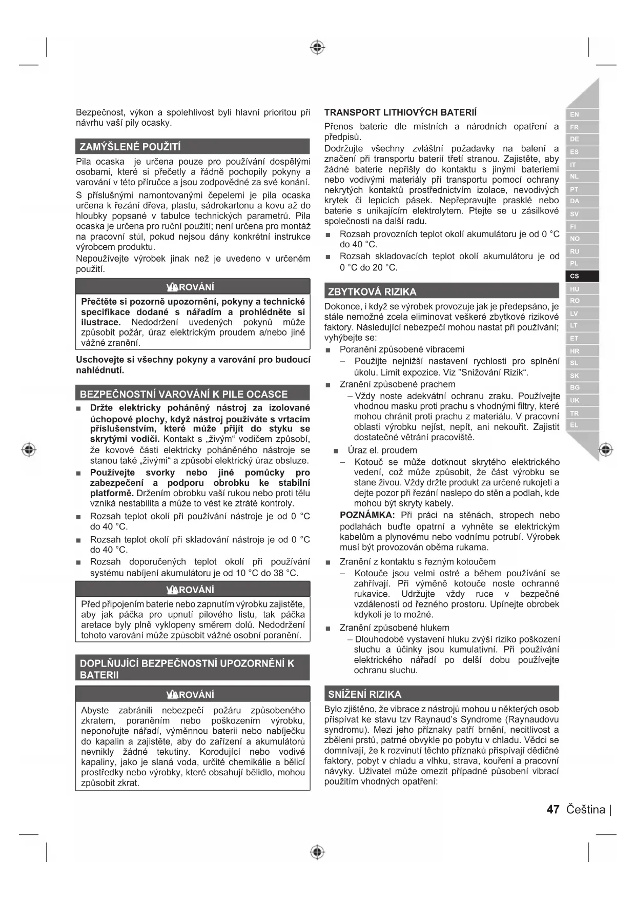 Přenos baterie dle místních a národních opatření a předpisů. Dodržujte všechny zvláštní požadavky na balení a značení při transportu baterií třetí stranou. Zajistěte, aby žádné baterie nepřišly do kontaktu s jinými bateriemi nebo vodivými materiály při transportu pomocí ochrany nekrytých kontaktů prostřednictvím izolace, nevodivých krytek či lepicích pásek. Nepřepravujte prasklé nebo baterie s unikajícím elektrolytem. Ptejte se u zásilkové společnosti na další radu. ■ Rozsah provozních teplot okolí akumulátoru je od 0 °C do 40 °C. ■ Rozsah skladovacích teplot okolí akumulátoru je od 0 °C do 20 °C. ZBYTKOVÁ RIZIKA Dokonce, i když se výrobek provozuje jak je předepsáno, je stále nemožné zcela eliminovat veškeré zbytkové rizikové faktory. Následující nebezpečí mohou nastat při používání; vyhýbejte se: ■ Poranění způsobené vibracemi – Použijte nejnižší nastavení rychlosti pro splnění úkolu. Limit expozice. Viz ”Snižování Rizik“. ■ Zranění způsobené prachem – Vždy noste adekvátní ochranu zraku. Používejte vhodnou masku proti prachu s vhodnými filtry, které mohou chránit proti prachu z materiálu. V pracovní oblasti výrobku nejíst, nepít, ani nekouřit. Zajistit dostatečné větrání pracoviště. ■ Úraz el. proudem – Kotouč se může dotknout skrytého elektrického vedení, což může způsobit, že část výrobku se stane živou. Vždy držte produkt za určené rukojeti a dejte pozor při řezání naslepo do stěn a podlah, kde mohou být skryty kabely. POZNÁMKA: Při práci na stěnách, stropech nebo podlahách buďte opatrní a vyhněte se elektrickým kabelům a plynovému nebo vodnímu potrubí. Výrobek musí být provozován oběma rukama. ■ Zranění z kontaktu s řezným kotoučem – Kotouče jsou velmi ostré a během používání se zahřívají. Při výměně kotouče noste ochranné rukavice. Udržujte vždy ruce v bezpečné vzdálenosti od řezného prostoru. Upínejte obrobek kdykoli je to možné. ■ Zranění způsobené hlukem – Dlouhodobé vystavení hluku zvýší riziko poškození sluchu a účinky jsou kumulativní. Při používání elektrického nářadí po delší dobu používejte ochranu sluchu.