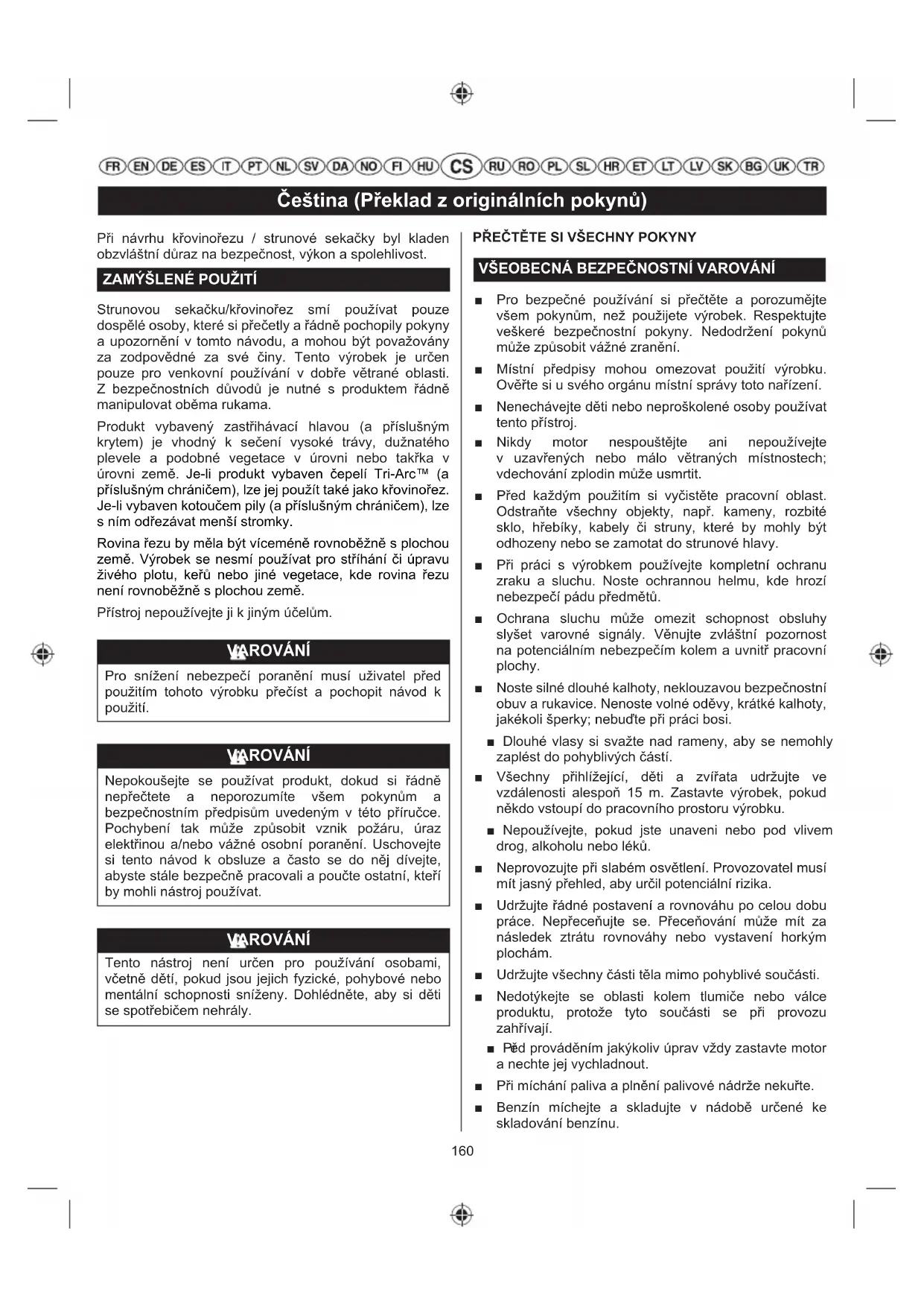 Strunovou sekačku/křovinořez smí používat pouze dospělé osoby, které si přečetly a řádně pochopily pokyny a upozornění v tomto návodu, a mohou být považovány za zodpovědné za své činy. Tento výrobek je určen pouze pro venkovní používání v dobře větrané oblasti. Z bezpečnostních důvodů je nutné s produktem řádně manipulovat oběma rukama. Produkt vybavený zastřihávací hlavou (a příslušným krytem) je vhodný k sečení vysoké trávy, dužnatého plevele a podobné vegetace v úrovni nebo takřka v úrovni země. Je-li produkt vybaven čepelí Tri-Arc™ (a příslušným chráničem), lze jej použít také jako křovinořez. Je-li vybaven kotoučem pily (a příslušným chráničem), lze s ním odřezávat menší stromky. Rovina řezu by měla být víceméně rovnoběžně s plochou země. Výrobek se nesmí používat pro stříhání či úpravu živého plotu, keřů nebo jiné vegetace, kde rovina řezu není rovnoběžně s plochou země. Přístroj nepoužívejte ji k jiným účelům. VAROVÁNÍ Pro snížení nebezpečí poranění musí uživatel před použitím tohoto výrobku přečíst a pochopit návod k použití. VAROVÁNÍ Nepokoušejte se používat produkt, dokud si řádně nepřečtete a neporozumíte všem pokynům a bezpečnostním předpisům uvedeným v této příručce. Pochybení tak může způsobit vznik požáru, úraz elektřinou a/nebo vážné osobní poranění. Uschovejte si tento návod k obsluze a často se do něj dívejte, abyste stále bezpečně pracovali a poučte ostatní, kteří by mohli nástroj používat. VAROVÁNÍ Tento nástroj není určen pro používání osobami, včetně dětí, pokud jsou jejich fyzické, pohybové nebo mentální schopnosti sníženy. Dohlédněte, aby si děti se spotřebičem nehrály. PŘEČTĚTE SI VŠECHNY POKYNY