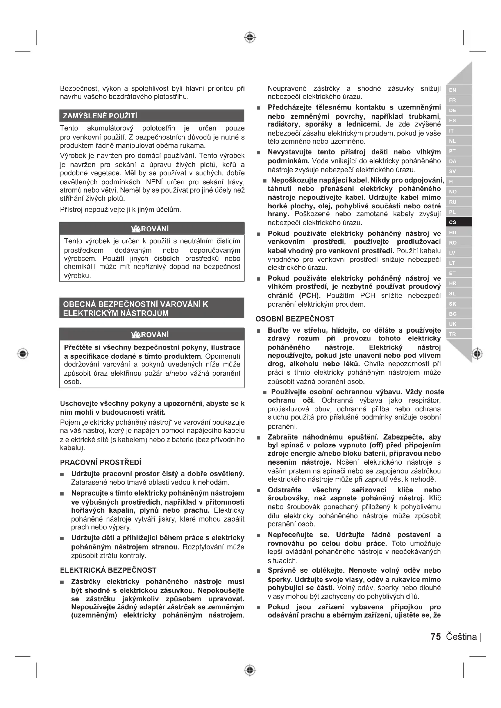 Pokud se výrobek zasekne, uvolněte obě spouštěcí tlačítka, odstraňte jakýkoliv materiál z ostří, počkejte 2 sekundy a potom obnovte provoz. DOPLŇUJÍCÍ BEZPEČNOSTNÍ VAROVÁNÍ ■ Místní předpisy mohou omezovat použití výrobku. Ověřte si u svého orgánu místní správy toto nařízení. Přečtěte si všechny pokyny ■ Před každým použitím si vyčistěte pracovní oblast. Odstraňte všechny předměty, například kabely, svítidla, dráty nebo strunu, které se mohou vymrštit nebo zamotat do sekacího nástroje. ■ Zkontrolujte živý plot na cizí předměty, např. drátěný plot. ■ Při používání výrobku v blízkosti plotů, sloupů, budov a jiných nemovitých předmětů dbejte zvýšené pozornosti. ■ Vyvarujte se odhazování objektů. Všechny přihlížející, zvláště děti a zvířata udržujte 15 m mimo pracovní oblasti. Zastavte výrobek, pokud někdo vstoupí do pracovního prostoru výrobku. ■ Nenechávejte děti nebo neproškolené osoby používat tento přístroj. ■ Výrobek nepoužívejte při špatném osvětlení. Obsluha musí mít čistý výhled na pracovní oblast k identifikaci potenciálních nebezpečí. ■ Vždy se ujistěte, že jsou nainstalovány všechny rukojeti a ochrany, když stroj používáte. Nikdy se nepokoušejte používat neúplný výrobek nebo výrobek opatřený neautorizovanými úpravami. ■ Před každým použitím se ujistěte, že všechny ovladače a jištění řádně fungují. Nástroj nepoužívejte, pokud přepínač „nevypíná“ (off) motor. ■ Zkontrolujte nástroj před každým použitím. Zkontrolujte včetně, zda nejsou uvolněny upínací a zda jsou všechny chrániče, vodící plechy a rukojetě řádně a bezpečně připojeny. Před použitím vyměňte jakékoliv poškozené součásti. Proveďte kontrolu akumulátoru na netěsnost. ■ Výrobek žádným způsobem neupravujte. ■ Při práci s výrobkem používejte kompletní ochranu zraku a sluchu. Noste ochrannou helmu, kde hrozí nebezpečí pádu předmětů. ■ Noste silné dlouhé kalhoty, boty a rukavice. Nenoste volné oděvy, krátké kalhoty, jakékoli šperky; nebuďte při práci bosi. ■ Dlouhé vlasy si svažte nad rameny, aby se nemohly zaplést do pohyblivých částí. ■ Uvědomte si, že použití ochrany sluchu snižuje vaši schopnost slyšet varování (poplachy nebo výkřiky). Obsluha si musí být tohoto vědoma a platí speciální upozornění, aby si všímala události v jeho pracovní oblasti. ■ Obsluha podobných nástrojů zvyšuje jak nebezpečí poranění sluchu, tak osob vstupujících do zóny práce. ■ Pilu nepoužívejte při únavě nebo v nemoci ani pod vlivem drog, alkoholu nebo léků. ■ Udržujte bezpečné postavení a rovnováhu. Nepřeceňujte se. Přeceňování může mít za následek ztrátu rovnováhy a vážné poranění. ■ Udržujte všechny části těla mimo pohyblivé součásti. ■ Před spuštěním nástroje se ujistěte, že nože nůžek nejsou s ničím v kontaktu. ■ Při stříhání živého plotu držte vždy nářadí pevně oběma rukama a zajistěte, abyste měli bezpečnou pracovní polohu. Výrobce nedoporučuje používat žebřík nebo schůdky. Je-li třeba práci vykonávat ve výšce, použijte nástroj pro práci ve výškách. ■ Žací lišty jsou ostré. Noste neklouzavé, odolné ochranné rukavice, když manipulujete s žací lištou. Nedávejte své ruce a prsty mezi žací lišty nebo do jakéhokoliv místa, kdy by se mohli uřezat nebo přiskřípnout. Nikdy se nedotýkejte žací lišty ani neprovádějte údržbu zařízení, pokud není vyndán akumulátor. ■ Rozmetadlo vypněte a vyjměte baterii. Ujistěte se, že se zastavily všechny pohyblivé díly: ● před seřizováním provozní polohy řezných prostředků ● před servisem ● před čištěním usazenin ● před kontrolou, čištěním nebo prací na nástroji, ● před výměnou příslušenství ● před opuštěním výrobku ● před kontrolou poškození po nárazu do předmětu ● před prováděním údržby ● pokud stroj začne abnormálně vibrovat ■ Nesnažte se plotostřih používat na hustý porost s použitím síly. Může to způsobit zaseknutí nože do dřeva a zpomalování. Pokud se nože zpomalují, snižte rychlost. ■ Nepokoušejte se řezat větve nebo kmeny silnější než 26 mm nebo evidentně příliš silné, na které nože nestačí. Použijte neelektrickou ruční pilu nebo vyvětvovací pilu pro řezání velkých větví. ■ Polostřih nepoužívejte s poškozenými nebo nadměrně opotřebovanými ostřími. VAROVÁNÍ Pokud začne po pádu, silných nárazech nástroj nenormálně vibrovat, zastavte nástroj a ihned zjistěte příčinu vibrací a rozsah škod. Pokud je nějaká část poškozena, musí se nechat řádně opravit nebo vyměnit pověřeným servisním střediskem. DOPLŇUJÍCÍ BEZPEČNOSTNÍ UPOZORNĚNÍ K BATERII VAROVÁNÍ Abyste zabránili nebezpečí požáru způsobeného zkratem, poraněním nebo poškozením výrobku, neponořujte nářadí, výměnnou baterii nebo nabíječku do kapalin a zajistěte, aby do zařízení a akumulátorů nevnikly žádné tekutiny. Korodující nebo vodivé kapaliny, jako je slaná voda, určité chemikálie a bělicí prostředky nebo výrobky, které obsahují bělidlo, mohou způsobit zkrat.78 | Čeština
