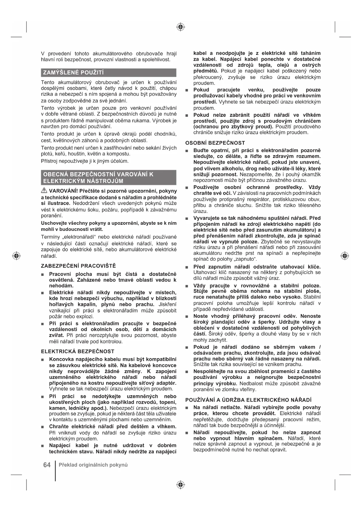 Překlad originálních pokynů■ Před jakýmikoli úpravami, výměnou příslušenství či uložením elektrického náčiní vyjměte zástrčku ze zdroje elektrického napájení, popřípadě vyjměte baterii z výrobku. Omezíte tak riziko nechtěného spuštění nářadí. ■ Nářadí uskladněte mimo dosah dětí. Nedovolte nezkušeným uživatelům a nepoučeným osobám, které se neseznámily s bezpečnostními předpisy, používat toto nářadí. Nářadí může být nebezpečné v rukou nezkušených osob. ■ Provádějte pravidelnou údržbu náčiní a příslušenství. Zkontrolujte, zda jsou pohyblivé prvky stroje v zákrytu. Zkontrolujte, zda žádný díl není zlomený. Zkontrolujte správnost montáže nářadí a funkčnost všech dílů, které mohou narušit bezpečný provoz nářadí. Pokud je některý díl nářadí poškozen, nářadí dále nepoužívejte a nechte ho opravit. Řada úrazů bývá zapříčiněna nesprávnou údržbou nářadí. ■ Nářadí udržujte čisté a naostřené. Správně naostřené a čisté nářadí bude méně blokovat. Nářadí tak budete mít lépe pod kontrolou. ■ Elektrické nářadí a jeho příslušenství používejte v souladu s pokyny v návodu a dodržujte doporučené podmínky používání vzhledem k povaze práce. Abyste se nedostali do nebezpečné situace, nářadí používejte pouze k předepsaným účelům. ■ Rukojeti a úchytné plochy udržujte suché, čisté a zbavené oleje a mastnoty. Kluzké rukojeti a úchytné plochy neumožňují v nečekaných situacích bezpečné použití výrobku a kontrolu nad ním. SPECIFICKÉ BEZPEČNOSTÍ POKYNY PŘI POUŽÍVÁNÍ
