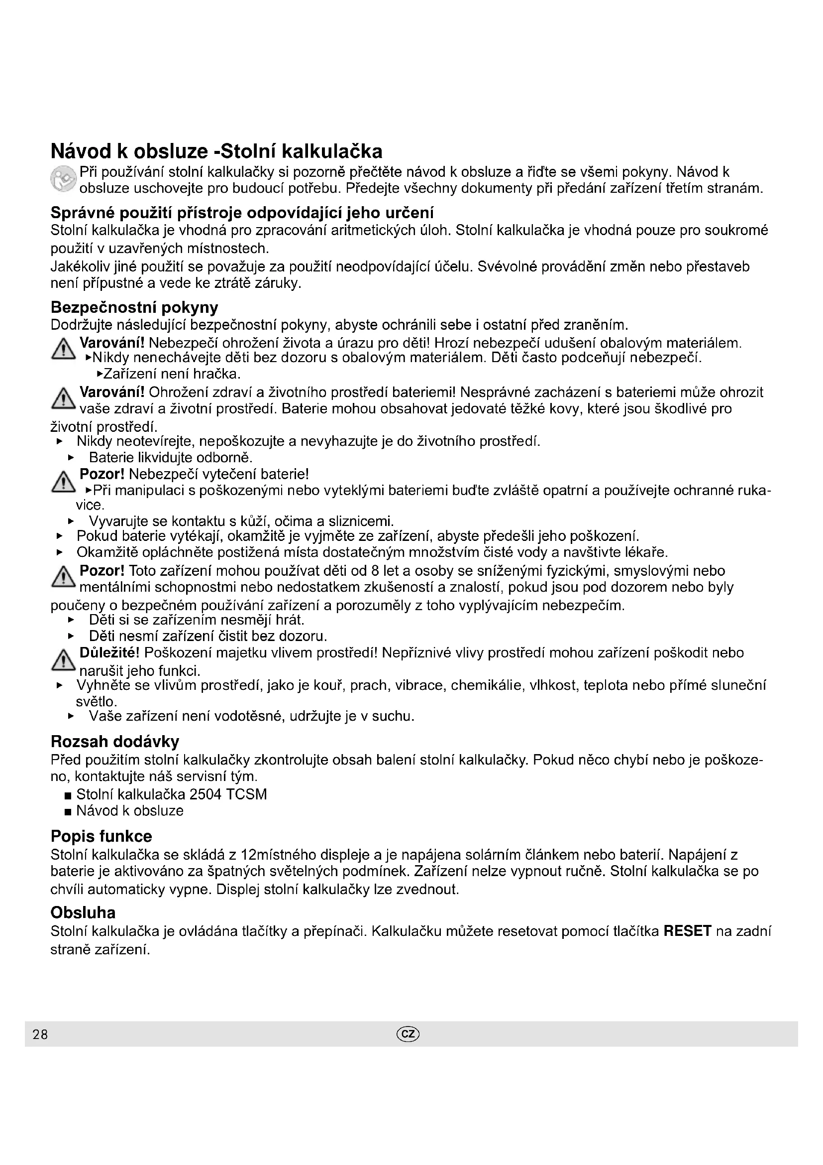 Návod k obsluze -Stolní kalkulačka Při používání stolní kalkulačky si pozorně přečtěte návod k obsluze a řiďte se všemi pokyny. Návod k obsluze uschovejte pro budoucí potřebu. Předejte všechny dokumenty při předání zařízení třetím stranám. Správné použití přístroje odpovídající jeho určení Stolní kalkulačka je vhodná pro zpracování aritmetických úloh. Stolní kalkulačka je vhodná pouze pro soukromé použití v uzavřených místnostech. Jakékoliv jiné použití se považuje za použití neodpovídající účelu. Svévolné provádění změn nebo přestaveb není přípustné a vede ke ztrátě záruky. Bezpečnostní pokyny Dodržujte následující bezpečnostní pokyny, abyste ochránili sebe i ostatní před zraněním. Varování! Nebezpečí ohrožení života a úrazu pro děti! Hrozí nebezpečí udušení obalovým materiálem.