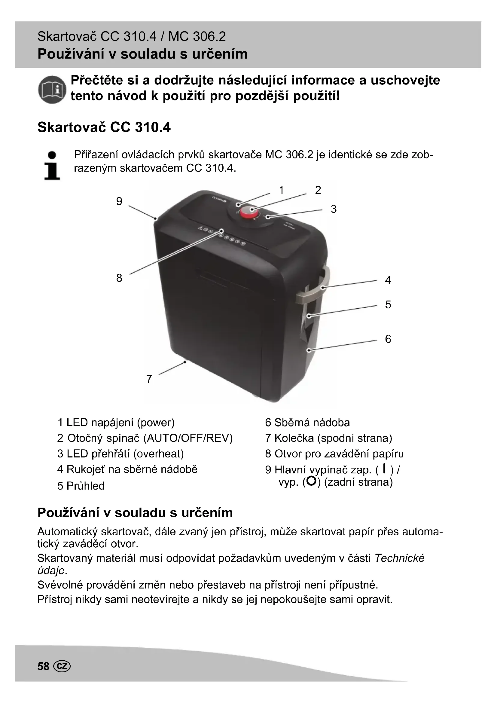 1 LED napájení (power) 2 Otočný spínač (AUTO/OFF/REV) 3 LED přehřátí (overheat) 4 Rukojeť na sběrné nádobě 5 Průhled 6 Sběrná nádoba 7 Kolečka (spodní strana) 8 Otvor pro zavádění papíru 9 Hlavní vypínač zap. (⏽) / vyp. (⭘) (zadní strana) Používání v souladu s určením Automatický skartovač, dále zvaný jen přístroj, může skartovat papír přes automa tický zaváděcí otvor. Skartovaný materiál musí odpovídat požadavkům uvedeným v části Technické údaje. Svévolné provádění změn nebo přestaveb na přístroji není přípustné. Přístroj nikdy sami neotevírejte a nikdy se jej nepokoušejte sami opravit.Bezpečnostní pokyny Skartovač CC 310.4 / MC 306.2 59C Používání, které není v souladu s daným účelem Automatický skartovač není určen ke skartaci materiálu, který neodpovídá poža davkům uvedeným v části den Technické údaje (např. lepenka). Jakékoli jiné použití než použití popsané v Používání k určenému účelu platí za používání k neurčenému účelu. Bezpečnostní pokyny Následující bezpečnostní pokyny platí pro celý dokument. Přečtěte si bezpečnost ní pokyny a respektujte je, abyste chránili sebe i životní prostředí.