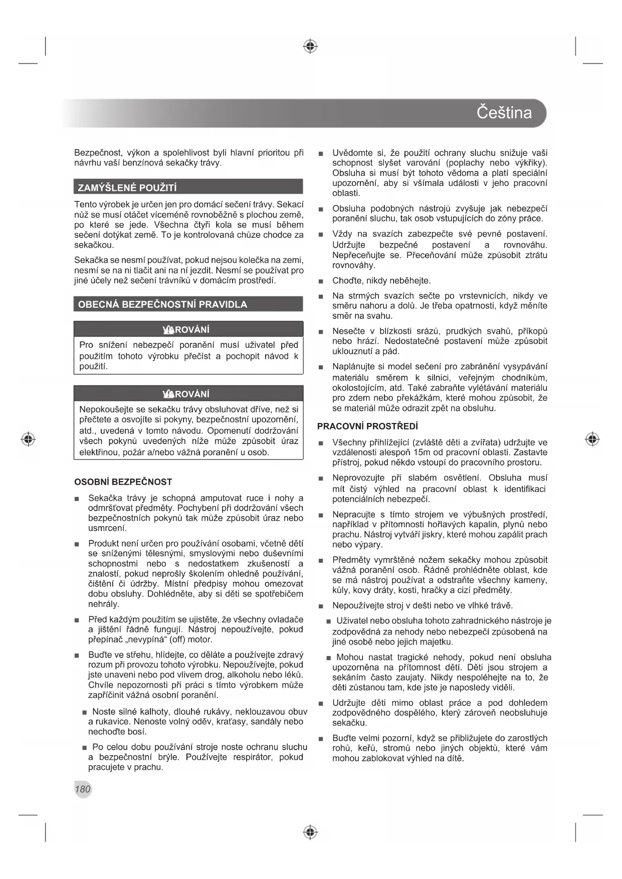 ■ Sekačka trávy je schopná amputovat ruce i nohy a odmršťovat předměty. Pochybení při dodržování všech bezpečnostních pokynů tak může způsobit úraz nebo usmrcení. ■ Produkt není určen pro používání osobami, včetně dětí se sníženými tělesnými, smyslovými nebo duševními schopnostmi nebo s nedostatkem zkušeností a znalostí, pokud neprošly školením ohledně používání, čištění či údržby. Místní předpisy mohou omezovat dobu obsluhy. Dohlédněte, aby si děti se spotřebičem nehrály. ■ Před každým použitím se ujistěte, že všechny ovladače a jištění řádně fungují. Nástroj nepoužívejte, pokud přepínač „nevypíná“ (off) motor. ■ Buďte ve střehu, hlídejte, co děláte a používejte zdravý rozum při provozu tohoto výrobku. Nepoužívejte, pokud jste unaveni nebo pod vlivem drog, alkoholu nebo léků. Chvíle nepozornosti při práci s tímto výrobkem může zapříčinit vážná osobní poranění. ■ Noste silné kalhoty, dlouhé rukávy, neklouzavou obuv a rukavice. Nenoste volný oděv, kraťasy, sandály nebo nechoďte bosí. ■ Po celou dobu používání stroje noste ochranu sluchu a bezpečnostní brýle. Používejte respirátor, pokud pracujete v prachu. ■ Uvědomte si, že použití ochrany sluchu snižuje vaši schopnost slyšet varování (poplachy nebo výkřiky). Obsluha si musí být tohoto vědoma a platí speciální upozornění, aby si všímala události v jeho pracovní oblasti. ■ Obsluha podobných nástrojů zvyšuje jak nebezpečí poranění sluchu, tak osob vstupujících do zóny práce. ■ Vždy na svazích zabezpečte své pevné postavení. Udržujte bezpečné postavení a rovnováhu. Nepřeceňujte se. Přeceňování může způsobit ztrátu rovnováhy. ■ Choďte, nikdy neběhejte. ■ Na strmých svazích sečte po vrstevnicích, nikdy ve směru nahoru a dolů. Je třeba opatrnosti, když měníte směr na svahu. ■ Nesečte v blízkosti srázů, prudkých svahů, příkopů nebo hrází. Nedostatečné postavení může způsobit uklouznutí a pád. ■ Naplánujte si model sečení pro zabránění vysypávání materiálu směrem k silnici, veřejným chodníkům, okolostojícím, atd. Také zabraňte vylétávání materiálu pro zdem nebo překážkám, které mohou způsobit, že se materiál může odrazit zpět na obsluhu.