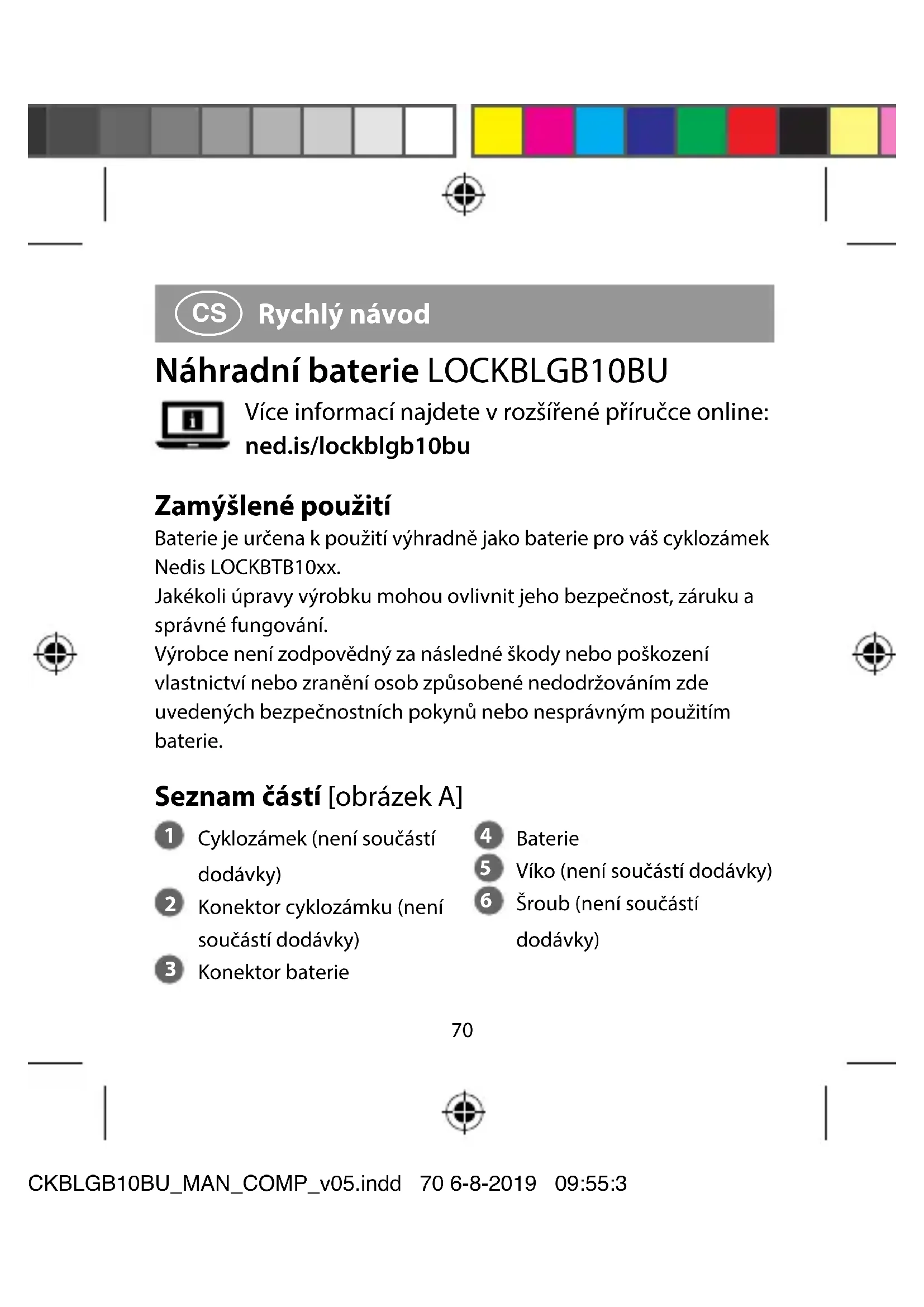 Rychlý návod Náhradní baterie LOCKBLGB10BU Více informací najdete v rozšířené příručce online: ned.is/lockblgb10bu Zamýšlené použití Baterie je určena k použití výhradně jako baterie pro váš cyklozámek Nedis LOCKBTB10xx. Jakékoli úpravy výrobku mohou ovlivnit jeho bezpečnost, záruku a správné fungování. Výrobce není zodpovědný za následné škody nebo poškození vlastnictví nebo zranění osob způsobené nedodržováním zde uvedených bezpečnostních pokynů nebo nesprávným použitím baterie. Seznam částí [obrázek A]