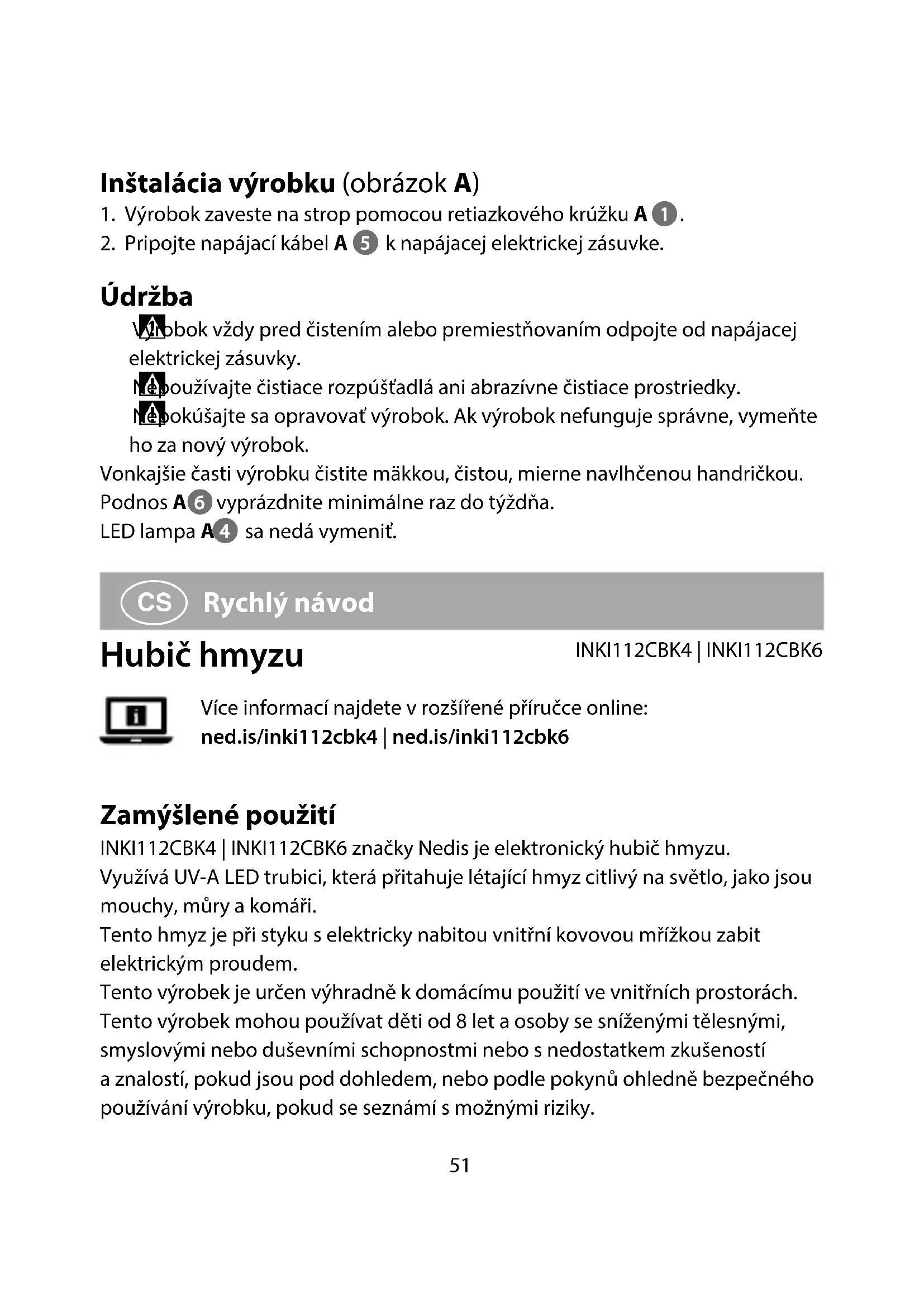 Rychlý návod Hubič hmyzu INKI112CBK4 | INKI112CBK6Více informací najdete v rozšířené příručce online: ned.is/inki112cbk4 | ned.is/inki112cbk6 Zamýšlené použití INKI112CBK4 | INKI112CBK6 značky Nedis je elektronický hubič hmyzu.Využívá UV-A LED trubici, která přitahuje létající hmyz citlivý na světlo, jako jsou mouchy, můry a komáři.Tento hmyz je při styku s elektricky nabitou vnitřní kovovou mřížkou zabit elektrickým proudem.Tento výrobek je určen výhradně k domácímu použití ve vnitřních prostorách.Tento výrobek mohou používat děti od 8let aosoby se sníženými tělesnými, smyslovými nebo duševními schopnostmi nebo snedostatkem zkušeností aznalostí, pokud jsou pod dohledem, nebo podle pokynů ohledně bezpečného používání výrobku, pokud se seznámí smožnými riziky.52 Jakékoli úpravy výrobku mohou ovlivnit jeho bezpečnost, záruku a správné fungování. Hlavní části (obrázek A) 1 Řetězové oko 2 Plášť 3 Kovová mřížka 4 Lampa UV-A LED 5 Napájecí kabel 6 Tác Bezpečnostní pokyny