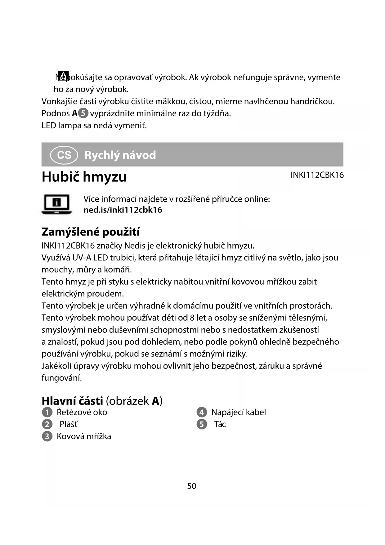 Rychlý návod Hubič hmyzu INKI112CBK16Více informací najdete v rozšířené příručce online: ned.is/inki112cbk16 Zamýšlené použití INKI112CBK16 značky Nedis je elektronický hubič hmyzu.Využívá UV-A LED trubici, která přitahuje létající hmyz citlivý na světlo, jako jsou mouchy, můry a komáři.Tento hmyz je při styku s elektricky nabitou vnitřní kovovou mřížkou zabit elektrickým proudem.Tento výrobek je určen výhradně k domácímu použití ve vnitřních prostorách.Tento výrobek mohou používat děti od 8let aosoby se sníženými tělesnými, smyslovými nebo duševními schopnostmi nebo snedostatkem zkušeností aznalostí, pokud jsou pod dohledem, nebo podle pokynů ohledně bezpečného používání výrobku, pokud se seznámí smožnými riziky.Jakékoli úpravy výrobku mohou ovlivnit jeho bezpečnost, záruku a správné fungování. Hlavní části (obrázek A) 1 Řetězové oko 2 Plášť 3 Kovová mřížka 4 Napájecí kabel 5 Tác51 Bezpečnostní pokyny