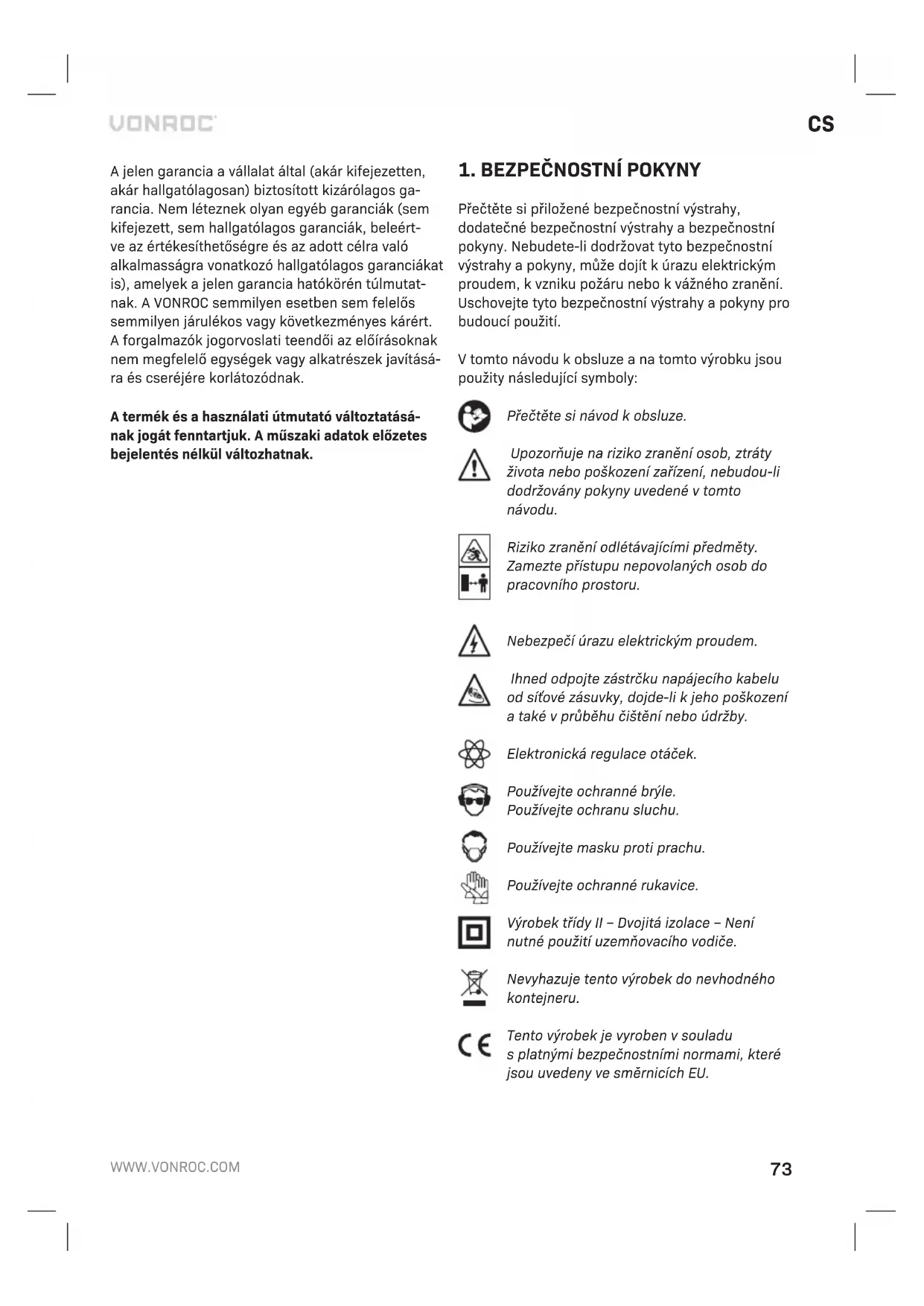 Poškozená a likvidovaná elektrická nebo elektronická zařízení musí být odevzdána ve sběrných dvorech, které jsou určeny pro tento účel. Pouze pro země EU Nevyhazujte elektrická nářadí do běžného domácí- ho odpadu. Podle evropské směrnice 2012/19/ES týkající se likvidace elektrických a elektronických zařízení a její implementace do vnitrostátního práva, musí být nepoužívaná elektrická nářadí shro- mažďována odděleně a jejich likvidace musíbýt provedena tak, aby nedošlo k ohrožení životního prostředí. ZÁRUKA Výrobky VONROC jsou vyvíjeny v souladu s poža- davky norem na nejvyšší kvalitu a je zaručeno, že po dobu platné záruky, která začíná běžet dnem původního nákupu, nebudou na těchto výrob- cích žádné vady materiálu, ani vady způsobené špatným dílenským zpracováním. Dojde-li během tohoto období k závadě v důsledku vady materiálu nebo dílenského zpracování, kontaktujte přímo firmuVONROC. Z této záruky jsou vyloučeny následující případy: