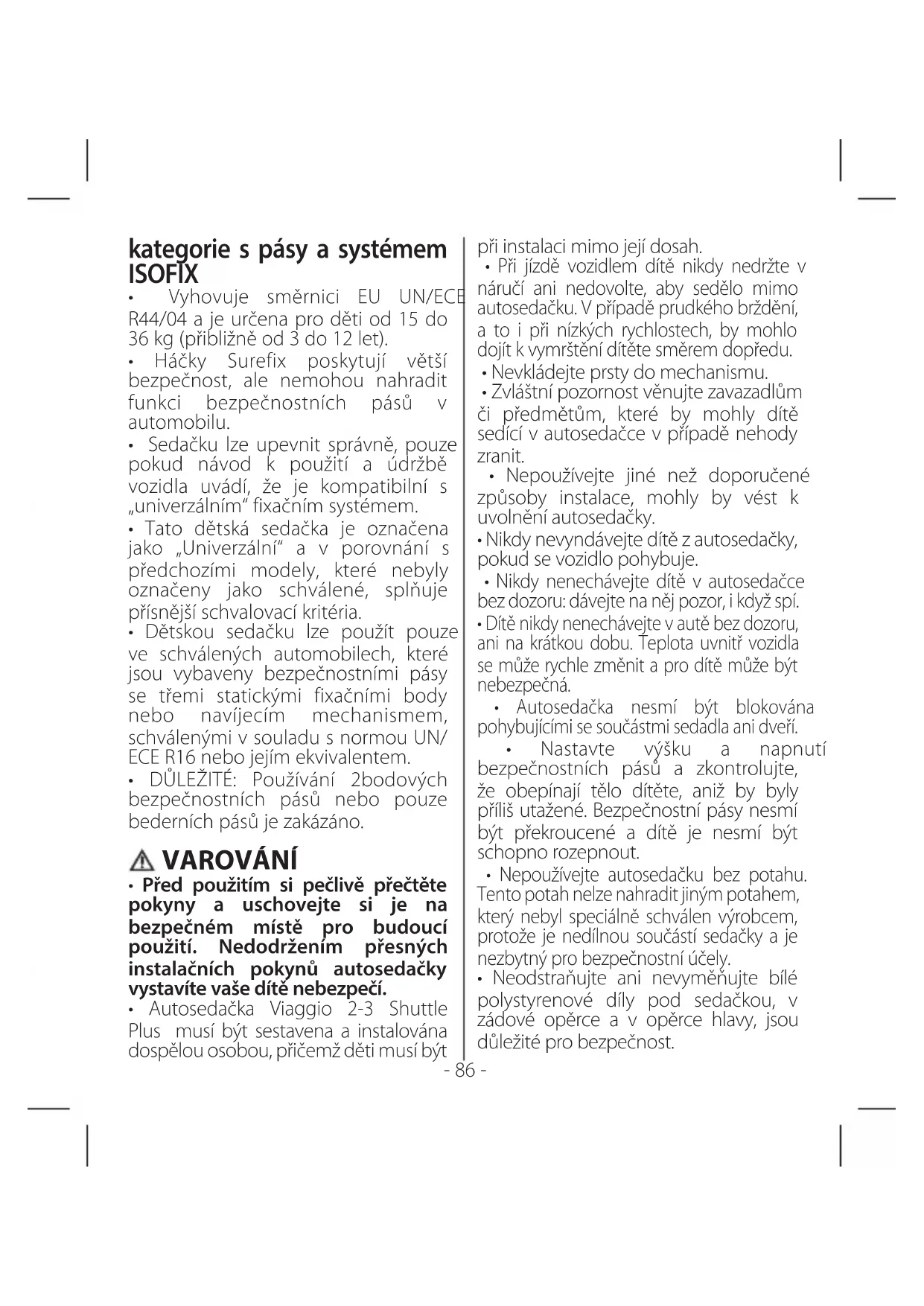 - DŮLEŽITÉ: Používání 2bodových bezpečnostních pásů nebo pouze bederních pásů je zakázáno. Autosedačka Viaggio 2-3 Shuttle Plus „polouniverzální“ CZ_Čeština- 86 - kategorie s pásy a systémem ISOFIX