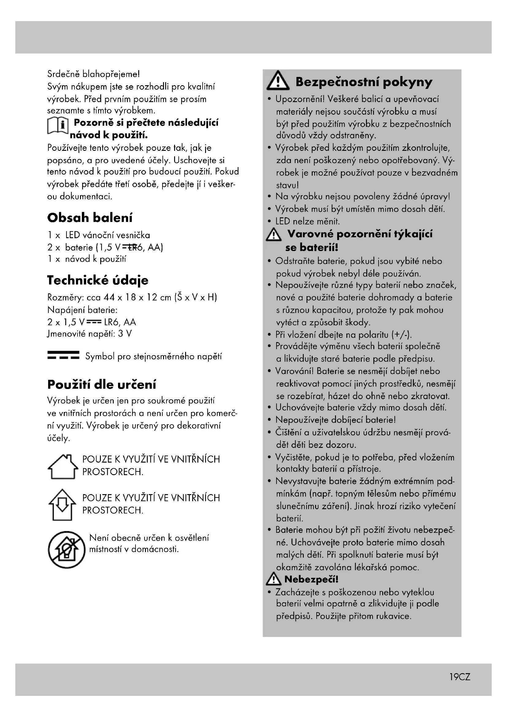 (obr. A). Vypínání a zapínání světla (obr. C) Posunutím spínače (1d) výrobek zapnete (ON) nebo vypnete (OFF). Funkci časovače výrobku aktivujete posunutím spínače (1d) do polohy TIMER. Upozornění: Při aktivované funkci časovač bude světlo 6 hodin zapnuté a 18 hodin bude vypnuté. Rytmus se opakuje denně. Pro lepší orientaci jsou na krytu baterie (1b) popisky OFF/TIMER/ON. Uskladnění, čištění Pokud výrobek nepoužíváte, skladujte jej vždy suchý, čistý, bez baterií a při pokojové teplotě. Utírejte pouze suchým hadříkem. DŮLEŽITÉ! K čištění nikdy nepoužívejte agresivní čisticí prostředky. Uskladnění, čištění Pokud výrobek nepoužíváte, skladujte jej vždy suchý, čistý, bez baterií a při pokojové teplotě. Utírejte pouze suchým hadříkem. DŮLEŽITÉ! K čištění nikdy nepoužívejte agresivní čisticí prostředky. Pokyny k likvidaci V zájmu ochrany životního prostředí nevyhazujte svůj výrobek do odpadu v případě, že dosloužil, ale odneste jej na profesionální místo k likvidaci. O sběrných místech a jejich otevírací době se můžete informovat u příslušné místní správy. Vadné nebo použité baterie/akumulátory musejí být recyklovány v souladu se směrnicí 2006/66/ES a jejími změnami. Odevzdejte baterie/akumulátory a/nebo výrobek prostřednictvím nabízených sběrných zařízení. Balicí materiály jako např. fóliové pytle nepatří do rukou dětí. Uchovávejte balicí materiál mimo dosah dětí. Poškození životního prostředí v důsledku nesprávné likvidace baterií/ akumulátorů! Baterie/akumulátory nesmějí být likvidovány spolu s komunálním odpadem. Mohou obsahovat toxické těžké kovy a podléhají zpracování nebezpečného odpadu. Chemické symboly těžkých kovů jsou následující: Cd = kadmium, Hg = rtuť, Pb = olovo. Použité baterie/akumulátory proto likvidujte v místním sběrném místě. Výrobek a obal zlikvidujte ekologicky. Při třídění odpadu dodržujte označení balicích materiálů, které jsou označeny zkratkami (a) a čísly (b) s následujícím významem: 1–7: plasty / 20–22: papír a karton / 80–98: smíšený odpad. Výrobek a balicí materiály jsou recyklovatelné, likvidujte je odděleně pro lepší zpracování odpadu. Logo Triman platí pouze pro Francii. Možnosti likvidace výrobku, který dosloužil, jsou k dispozici u místní nebo městské správy.21CZ Pokyny k záruce a průběhu služby Produkt byl vyrobený s velkou pečlivostí a byl průběžně kontrolovaný ve výrobní procesu. Na tento produkt obdržíte tříroční záruku ode dne zakoupení. Uschovejte si pokladní stvrzen- ku. Záruka se vztahuje jen na vady materiálu a chyby z výroby, nevztahuje se na závady způsobené neodborným zacházením nebo použitím k jinému účelu. Tato záruka neomezuje Vaše zákonná ani záruční práva. Při případných reklamacích se obraťte na dole uvedenou servisní horkou linku nebo nám zašlete email. Náš servisní pracovník s Vámi co nejrychleji upřesní další postup. V každém případě Vám osobně poradíme. Záruční doba se neprodlužuje po případných opravách v době záruky ani v případě zákon- ného ručení nebo kulance. Toto platí také pro náhradní a opravené díly. Opravy prováděné po vypršení záruční lhůty se platí. IAN: 323296_1901 Servis Česko Tel.: 800143873 E-Mail: deltasport@lidl.cz22 Blahoželáme! Svojím nákupom ste sa rozhodli pre kvalitný výrobok. Pred prvým použitím sa s výrobkom dôkladne oboznámte. Pozorne si prečítajte tento návod na použivanie. Výrobok používajte len uvedeným spôsobom a na uvedený účel. Tento návod na použivanie si dobre uschovajte. Pri odovzdávaní výrobku tretej osobe odovzdajte s výrobkom aj všetky podklady. Rozsah dodávky 1 x LED vianočná dedinka 2 x batéria (1,5 V LR6, AA) 1 x návod na používanie Technické údaje Rozmery: cca 44 x 18 x 12 cm (Š x V x H) Prevádzka na batérie: 2 x 1,5 V LR6, AA Menovité napätie: 3 V Symbol pre jednosmerné napätie Určené použitie Výrobok je určený len na súkromné použitie v interiéri a nie je určený na komerčné použitie. Výrobok je vhodný na dekoratívne účely. LEN NA POUŽITIE V INTERIÉROCH. LEN NA POUŽITIE V INTERIÉROCH. Výrobok nie je vhodný na všeobecné osvetlenie priestorov v domácnosti. Bezpečnostné pokyny