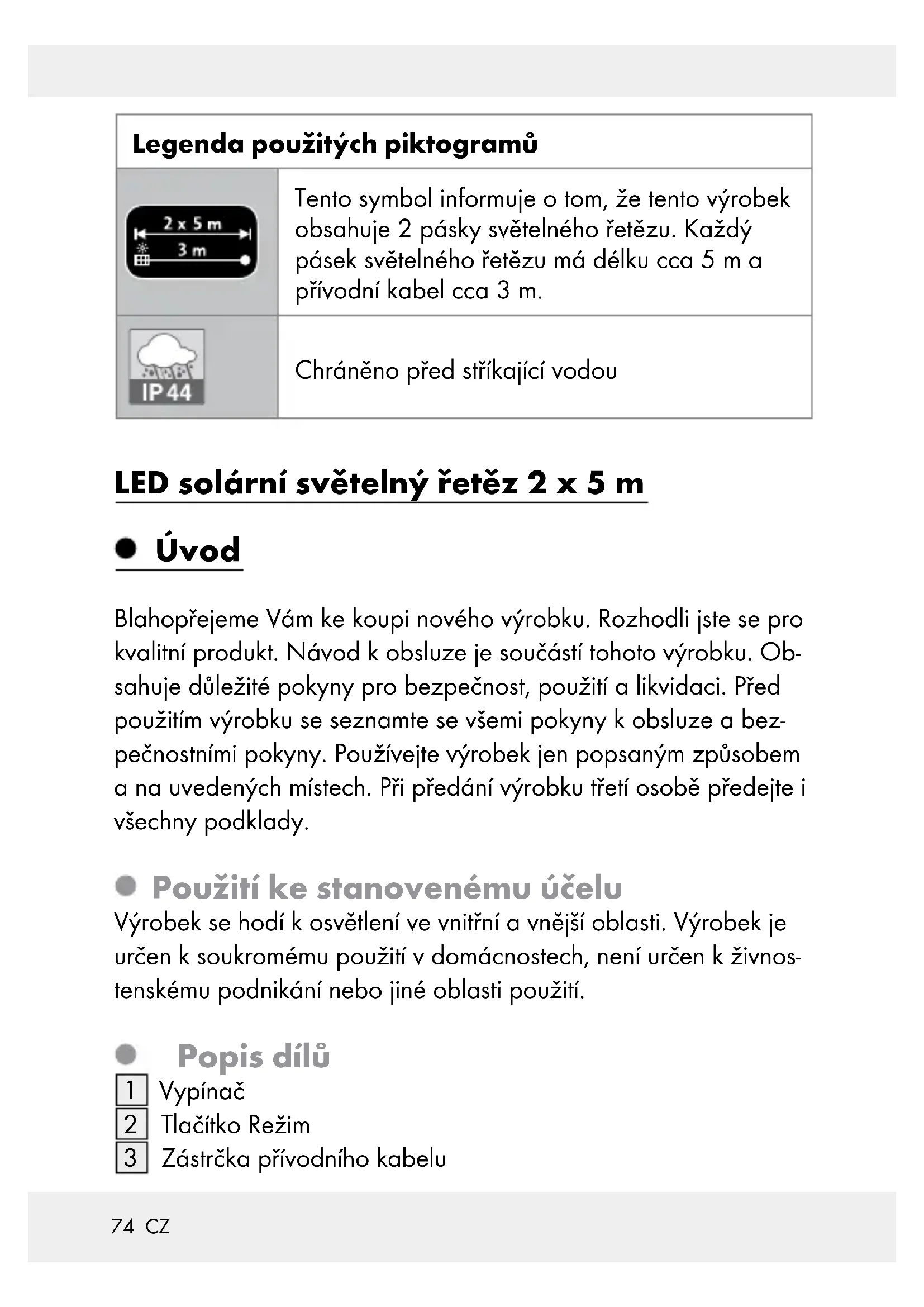 Při třídění odpadu se řiďte podle označení obalových materiálů zkratkami (a) a čísly (b), s následujícím význa- mem: 1–7: umělé hmoty / 20–22: papír a lepenka / 80–98: složené látky. Výrobek a obalové materiály jsou recyklovatelné, zlikvi- dujte je odděleně pro lepší odstranění odpadu. Logo Triman platí jen pro Francii. O možnostech likvidace vysloužilých zařízení se infor- mujte u správy vaší obce nebo města. Vzájmu ochrany životního prostředí vysloužilý výrobek nevyhazujte do domovního odpadu, ale předejte k od- borné likvidaci. O sběrnách a jejich otevíracích hodinách se můžete informovat u příslušné správy města nebo obce. Vadné nebo vybité baterie resp. akumulátory se musí, podle směrnice 2006/66/ES a jejích příslušných změn, recyklovat. Baterie, aku- mulátory i výrobek odevzdejte zpět do nabízených sběren.83 CZ Ekologické škody v důsledku chybné likvidace baterií / akumulátorů! Baterie / akumulátory se nesmí zlikvidovat v domácím odpadu. Mohou obsahovat jedovaté těžké kovy a musí se zpracovávat jako zvláštní odpad. Chemické symboly těžkých kovů: Cd = kadmium, Hg = rtuť, Pb = olovo. Proto odevzdejte opotřebované baterie / akumulátory u komunální sběrny. Záruka Výrobek byl vyroben s nejvyšší pečlivostí podle přísných kvalitativ- ních směrnic a před odesláním prošel výstupní kontrolou. V případě závad máte možnost uplatnění zákonných práv vůči prodejci. Vaše práva ze zákona nejsou omezena naší níže uvedenou zárukou. Na tento artikl platí 3 záruka od data zakoupení. Záruční lhůta začíná od data zakoupení. Uschovejte si dobře originál pokladní stvrzenky. Tuto stvrzenku budete potřebovat jako doklad o zakoupení. Pokud se do 3 let od data zakoupení tohoto výrobku vyskytne vada materiálu nebo výrobní vada, výrobek Vám – dle našeho rozhod- nutí – bezplatně opravíme nebo vyměníme. Tato záruka zaniká, jestliže se výrobek poškodí, neodborně použil nebo neobdržel pravidelnou údržbu. Záruka platí na vady materiálu a výrobní vady. Tato záruka se ne- vztahuje na díly výrobku podléhající opotřebení (např. na baterie), dále na poškození křehkých, choulostivých dílů, např. vypínačů, akumulátorů nebo dílů zhotovených ze skla.84 CZ Postup v případě uplatňování záruky Pro zajištění rychlého zpracování Vašeho případu se řiďte násle- dujícími pokyny: Pro všechny požadavky si připravte pokladní stvrzenku a číslo arti- klu (např. IAN 123456_7890) jako doklad o zakoupení. Číslo artiklu najdete na typovém štítku, gravuře, titulní stránce ná- vodu (vlevo dole) nebo na nálepce na zadní nebo spodní straně. V případě poruch funkce nebo jiných závad nejdříve kontaktujte, telefonicky nebo e-mailem, v následujícím textu uvedené servisní oddělení. Výrobek registrovaný jako vadný potom můžete s přiloženým do- kladem o zakoupení (pokladní stvrzenkou) a údaji k závadě a kdy k ní došlo, bezplatně zaslat na adresu servisu, která Vám byla sdělena. Servis Servis Česká republika Tel.: 800 143 873 E-Mail: owim@lidl.cz85 SK Legenda použitých piktogramov ..........Strana 86 Úvod ...............................................................................Strana 86 Používanie v súlade s určeným účelom ........................Strana 86 Popis častí .......................................................................Strana 87 Obsah dodávky .............................................................Strana 87 Technické údaje .............................................................Strana 87 Bezpečnostné upozornenia ........................Strana 88 Bezpečnostné pokyny špecifické pre výrobok .............Strana 89 Bezpečnostné upozornenia týkajúce sa batérií / akumulátorových batérií ..................................Strana 89 Spôsob činnosti .....................................................Strana 90 Montáž .........................................................................Strana 91 Obsluha .......................................................................Strana 91 Umiestnenie produktu ....................................................Strana 91 Funkcia časovača ..........................................................Strana 93 Údržba a čistenie .................................................Strana 93 Odstraňovanie porúch....................................Strana 94 Likvidácia ...................................................................Strana 94 Záruka ..........................................................................Strana 96 Postup v prípade poškodenia v záruke ........................Strana 97 Servis ...............................................................................Strana 9786 SK Legenda použitých piktogramov Tento symbol udáva, že výrobok pozostáva z 2 pásov svetelných reťazí. Každý pás svetelnej reťaze meria cca. 5 m a prívodové vedenie cca. 3 m. S ochranou proti striekajúcej vode LED solárna svetelná reťaz 2 x 5 m Úvod Blahoželáme Vám ku kúpe Vášho nového výrobku. Rozhodli ste sa pre veľmi kvalitný výrobok. Návod na obsluhu je súčasťou tohto výrobku. Obsahuje dôležité upozornenia týkajúce sa bezpečnosti, používania a likvidácie. Skôr ako začnete výrobok používať, oboznámte sa so všetkými pokynmi k obsluhe a bezpečnosti. Výrobok používajte iba v súlade s popisom a v uvedených oblas- tiach používania. V prípade postúpenia výrobku ďalším osobám odovzdajte aj všetky dokumenty patriace k výrobku. Používanie v súlade s určeným účelom Výrobok slúži na osvetlenie vo vnútorných a vonkajších priestoroch. Výrobok je určený pre súkromné domácnosti a nie je určený na komerčné účely alebo pre iné oblasti nasadenia.87 SK Popis čast