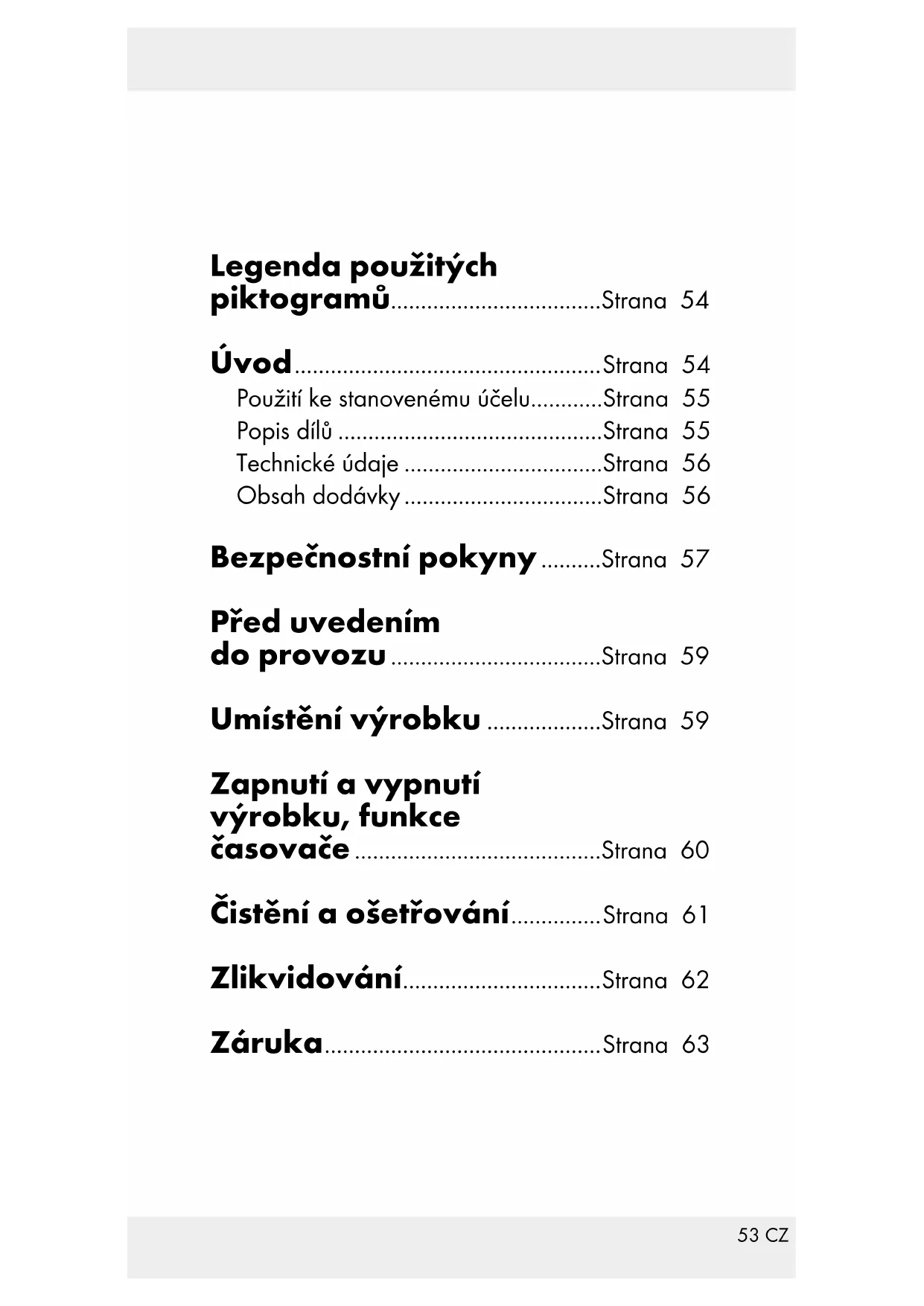 TRICKÝM PROUDEM! Zdůvodů elektrické bezpečnosti nesmíte výrobek nikdy ponořit do vody. Nepoužívejte žádná rozpouštědla, benzín apod. Výrobek by se mohl poškodit. Výrobek čistěte pravidelně suchým hadrem, který nepouští vlákna. Při silnějším znečištění použijte mírně navlhčený hadr.62 CZ Zlikvidování Obal se skládá zekologických materiálů, které můžete zlikvidovat pro- střednictvím místních sběren recyklova- telných materiálů. Zelený bod neplatí pro Německo.