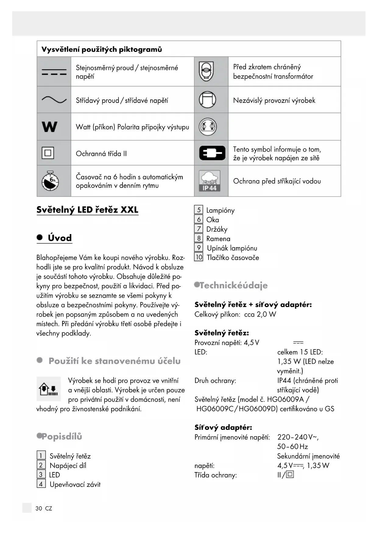 Tlačítko časovače Technické údaje Světelný řetěz + síťový adaptér: Celkový příkon: cca 2,0 W Světelný řetěz: Provozní napětí: 4,5 V LED: celkem 15LED: 1,35 W (LED nelze vyměnit.) Druh ochrany: IP44 (chráněné proti stříkající vodě) Světelný řetěz (model č. HG06009A / HG06009C / HG06009D) certifikováno u GS Síťový adaptér: Primární jmenovité napětí: 220‒240 V∼, 50‒60 Hz Sekundární jmenovité napětí: 4,5 V , 1,35 W Třída ochrany: II /31 CZ Druh ochrany: IP44 (chráněné proti stříka- jící vodě) Síťový adaptér (model č. JT-DC4.5V1.35W-H4-IP44) certifikován u GS SELV: oddělené malé napětí (Safety extra low voltage) Ta: maximální teplota okolního prostředí Tc: maximální Teplota tělesa předřazeného zařízení Obsah dodávky 1 světelný LED řetěz XXL 15 lampiónů 1 síťový adaptér 1 návod kobsluze Bezpečnostní pokyny