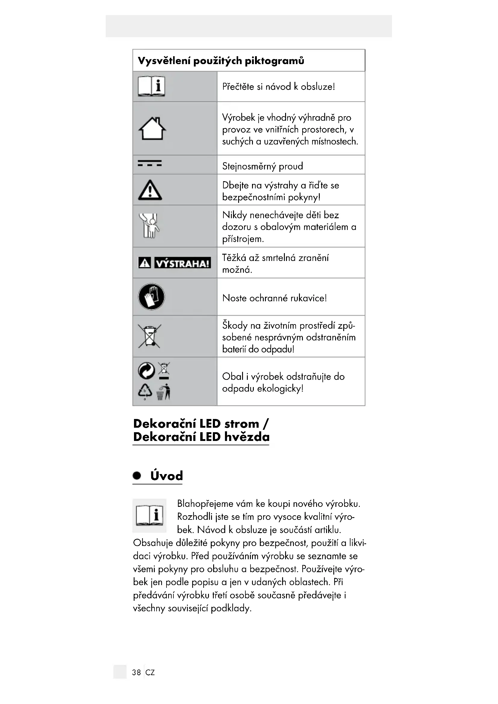 Obal i výrobek odstraňujte do odpadu ekologicky! Dekorační LED strom / Dekorační LED hvězda Úvod Blahopřejeme vám ke koupi nového výrobku. Rozhodli jste se tím pro vysoce kvalitní výro- bek. Návod k obsluze je součástí artiklu. Obsahuje důležité pokyny pro bezpečnost, použití a likvi- daci výrobku. Před používáním výrobku se seznamte se všemi pokyny pro obsluhu a bezpečnost. Používejte výro- bek jen podle popisu a jen v udaných oblastech. Při předávání výrobku třetí osobě současně předávejte i všechny související podklady.39 CZ Použití ke stanovenému účelu Výrobek slouží jen k dekorativnímu osvětlení v suchých místnostech. Výrobek je určen pouze pro privátní použití, není vhodný pro komerční účely. Výrobek je vhodný výhradně pro provoz ve vnitřních prostorách, v suchých a uza- vřených místnostech. Popis dílů