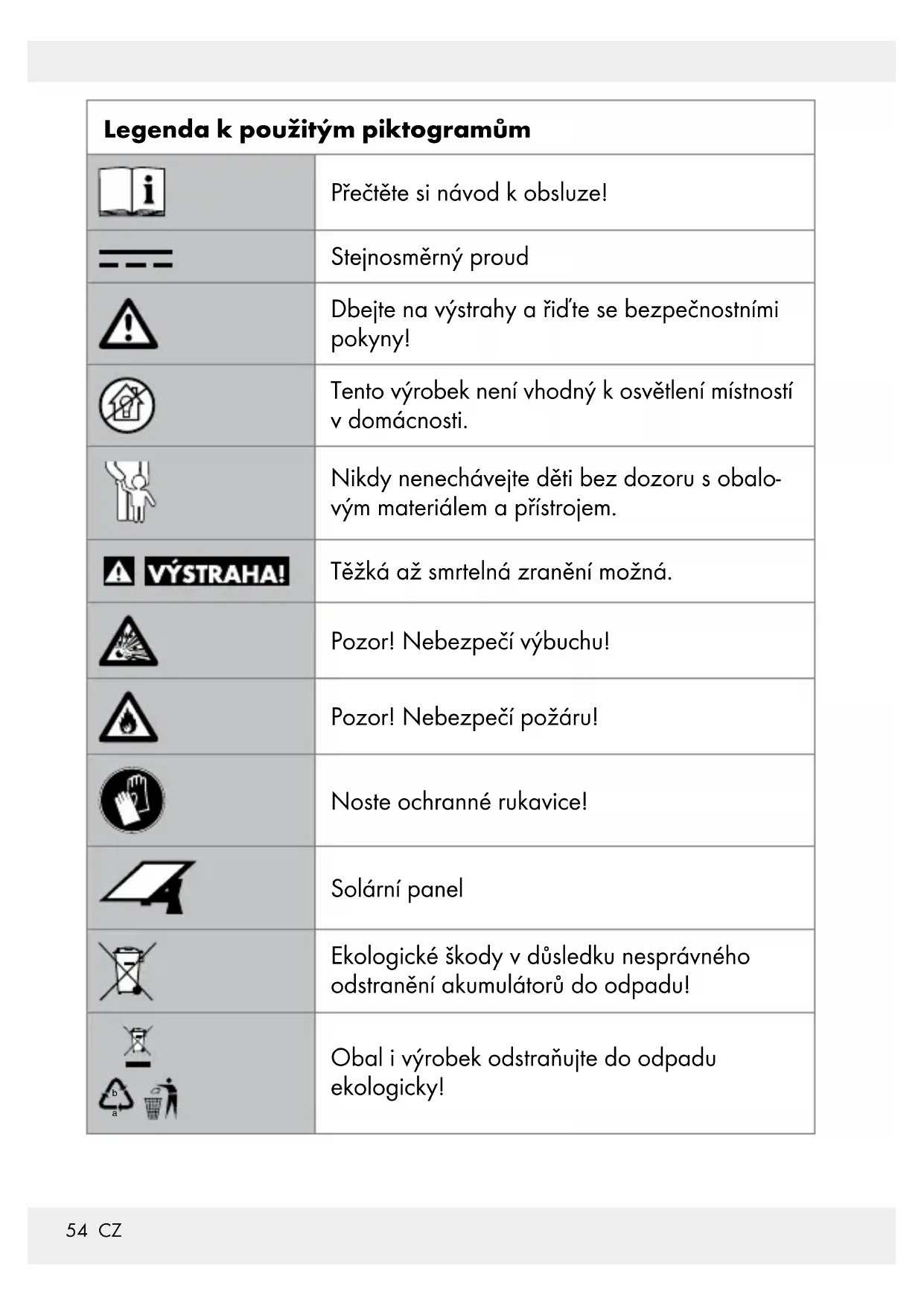 DĚTI A DĚTI! Akumulátory nepatří do dětských rukou. Nenechávejte ležet akumulá- tory přístupné. Hrozí nebezpečí, že je děti nebo domácí zvířata spolknou. Vpřípadě spolknutí okamžitě vyhledejte lékaře. POZOR! NEBEZPEČÍ EX- PLOZE! Používejte pouze akumulátorové články doporučeného typu. Jiné akumulátorové články by mohly během nabíjení vybuch- nout. NEBEZPEČÍ POŽÁRU! Akumu- látory se nesmí spo- jovat do zkratu. Následkem by mohlo být přehřátí, nebez- pečí požáru nebo prasknutí akumulátoru. POZOR! NEBEZPEČÍ EXPLOZE! Nikdy neházejte baterie do ohně nebo vody. U starých nebo provozu ne- schopných akumulátorů může dojít k úniku chemických látek, které poškodí výrobek. Proto odstraňte akumulátor ze svě- telného řetězu, jestliže ho ne- budete delší dobu používat. NOSTE OCHRAN- NÉ RUKAVICE! Vyteklé nebo po- škozené akumulátorové články mohou při kontaktu spokožkou způsobit poleptání, proto noste bezpodmínečně vhodné ochranné rukavice.