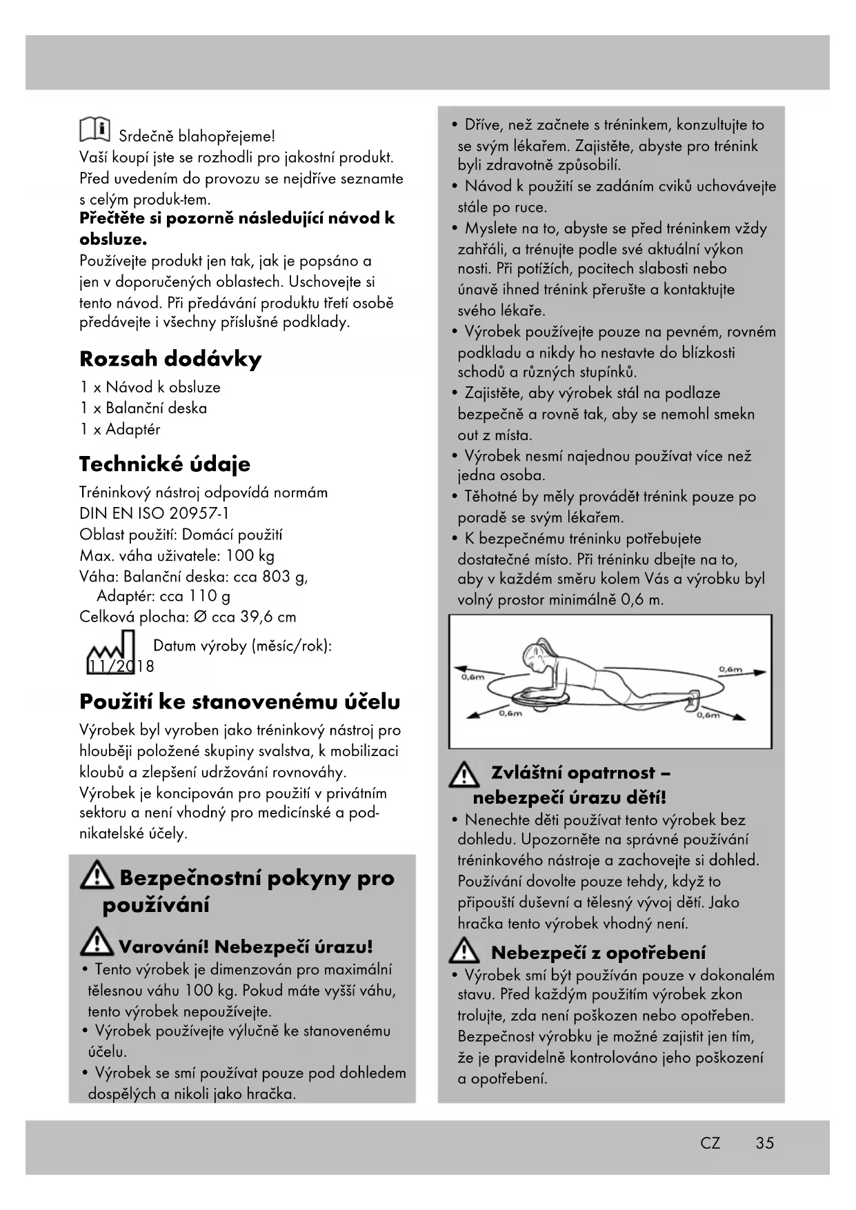 Oblast použití: Domácí použití Max. váha uživatele: 100 kg Váha: Balanční deska: cca 803 g, Adaptér: cca 110 g Celková plocha: Ø cca 39,6 cm Datum výroby (měsíc/rok): 11/2018 Použití ke stanovenému účelu Výrobek byl vyroben jako tréninkový nástroj pro hlouběji položené skupiny svalstva, k mobilizaci kloubů a zlepšení udržování rovnováhy. Výrobek je koncipován pro použití v privátním sektoru a není vhodný pro medicínské a pod- nikatelské účely. Bezpečnostní pokyny pro používání Varování! Nebezpečí úrazu!