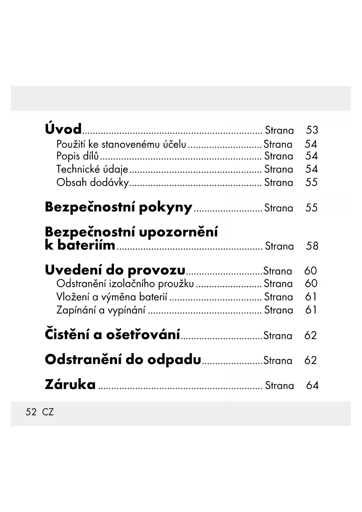 ŽIVOTA! Baterie nepatří do dětských rukou. V případě spolknutí okamžitě vyhledejte lékařskou pomoc! POZOR! NEBEZPEČÍ EXPLOZE! Nenabíjejte baterie nevhodné k nabí- jení, nezkratujte baterie ani je neotví- rejte!59 CZ Nikdy neházejte baterie do ohně nebo do vody! Nevystavujte baterie mechanickému zatížení! Nebezpečí vytečení baterií V případě vytečení baterií je ihned odstraňte z výrobku, aby jste zamezili jeho poškození! Vyhýbejte se kontaktu s pokožkou, očima a slizni- cemi! Po kontaktu s kyselinou baterií ihned omyjte postižená místa dostatečným množstvím čisté vody a okamžitě vyhledejte lékařskou pomoc! Používejte jen baterie stejného typu! Nekombinujte staré baterie s novými! Zabraňte extrémním podmínkám a teplotám, které mohou negativně ovlivnit funkci baterií, např. blíz- kosti topných těles/přímému slunečnímu záření.60 CZ Při delším nepoužívání odstraňte baterie z výrobku! Nebezpečí poškození výrobku Používejte jen udaný typ baterie! Při vložení dbejte na správnou polaritu! Polarita je vyznačena v přihrádce na baterie! V případě potřeby před vložením baterií vyčistěte jejich kontakty a také kontakty přístroje! Vybité baterie ihned z výrobku odstraňte! Uvedení do provozu Odstranění izolačního proužku Upozornění: Výrobek je dodaný již s bateriemi.61 CZ Před uvedením do provozu vytáhněte izolační proužek z přihrádky na baterie