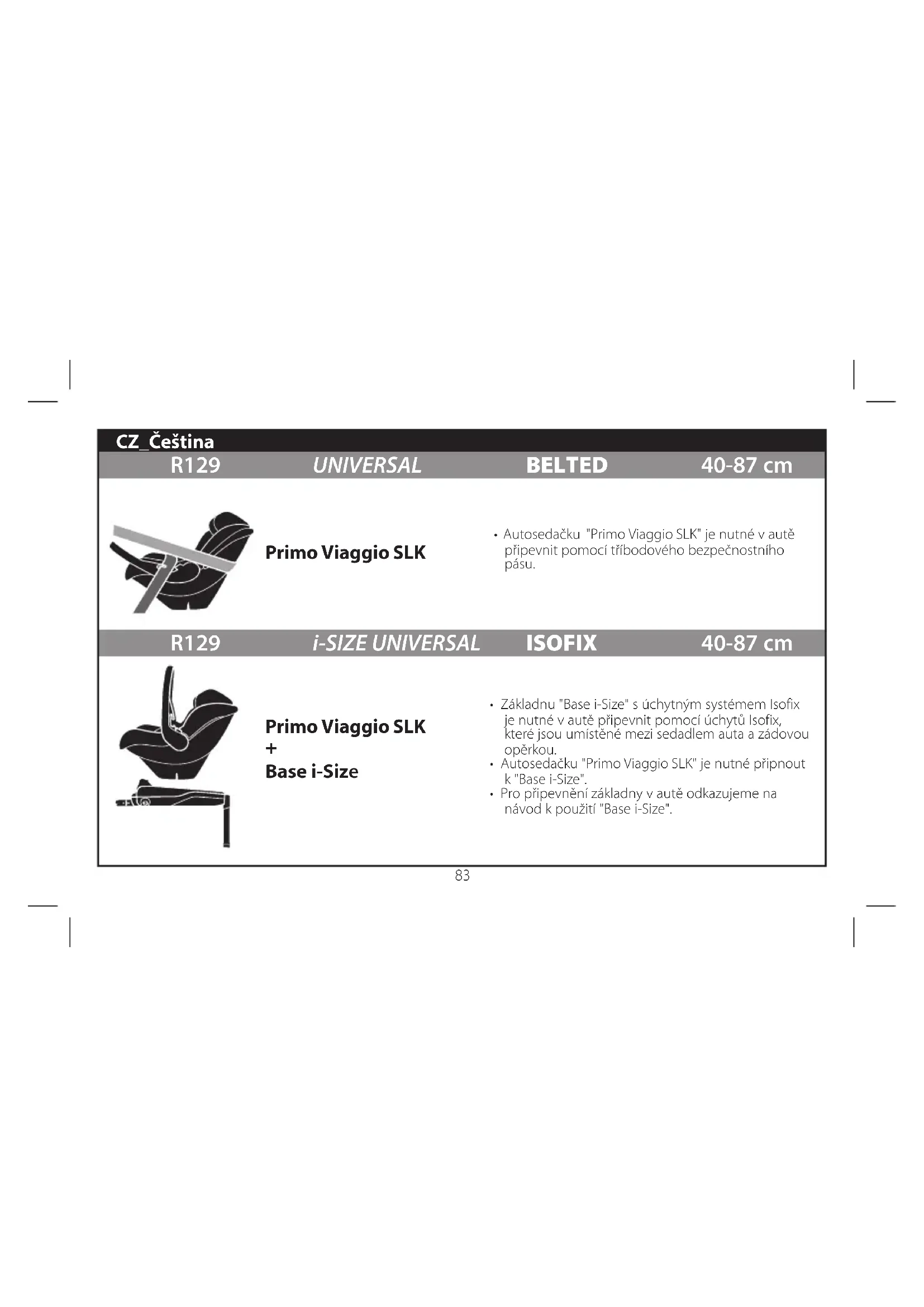 - Pro připevnění základny v autě odkazujeme na návod k použití "Base i-Size". R129 UNIVERSAL BELTED 40-87 cm R129 i-SIZE UNIVERSAL ISOFIX 40-87 cm Primo Viaggio SLK Primo Viaggio SLK