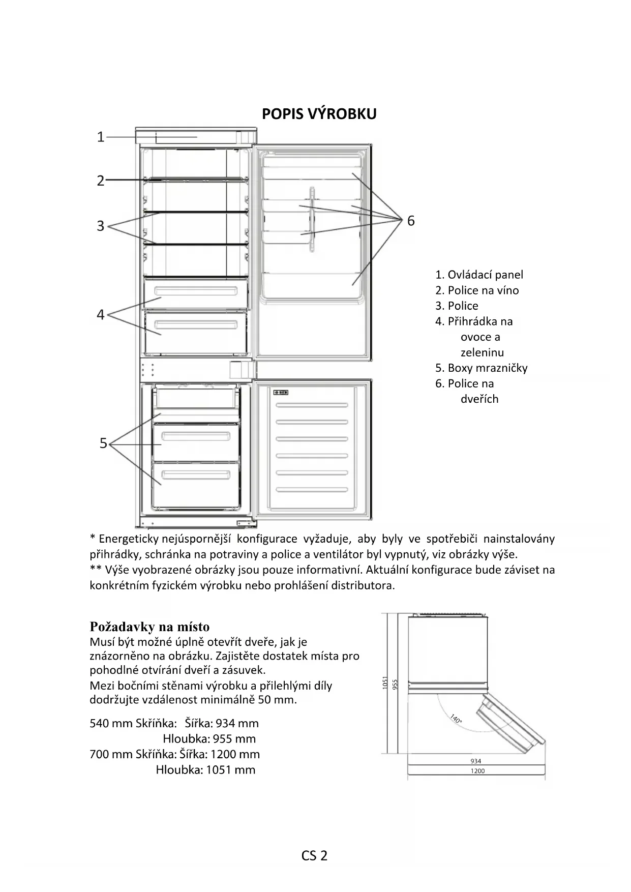 1. Ovládací panel2. Police na víno3. Police4. Přihrádka naovoce azeleninu5. Boxy mrazničky6. Police nadveřích* Energeticky nejúspornější konfigurace vyžaduje, aby byly ve spotřebiči nainstalovány přihrádky, schránka na potraviny a police a ventilátor byl vypnutý, viz obrázky výše.** Výše vyobrazené obrázky jsou pouze informativní. Aktuální konfigurace bude záviset nakonkrétním fyzickém výrobku nebo prohlášení distributora.Požadavky na místo Musí být možné úplně otevřít dveře, jak je znázorněno na obrázku. Zajistěte dostatek místa pro pohodlné otvírání dveří a zásuvek. Mezi bočními stěnami výrobku a přilehlými díly dodržujte vzdálenost minimálně 50 mm.